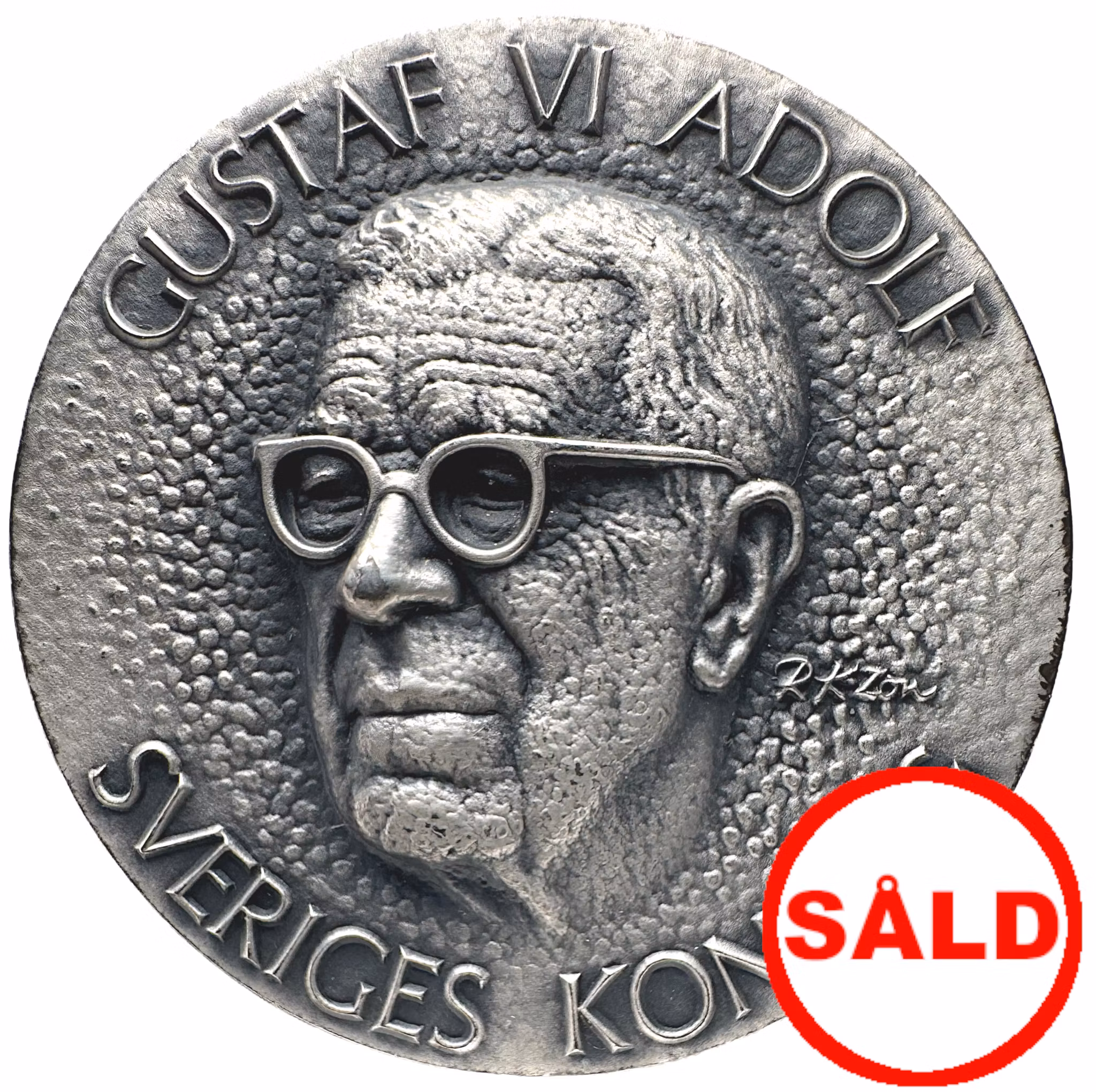 Bröstbild av Gustaf VI Adolf, Sveriges konung, vänd åt vänster. Kungen avbildad i hög ålder med glasögon. Omskrift" "GUSTAF VI ADOLF upptill, SVERIGES KONUNG nedtill. Signatur i fältet: "R K-zon".