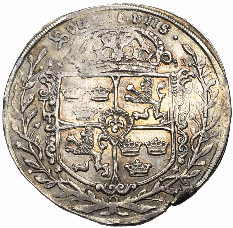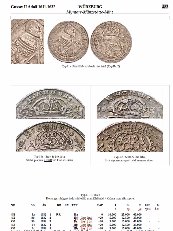 Samtliga talrar från Würzburg är präglade på något ojämna myntämnen, delvis svagt utpräglade och med mindre plantsfel. Detta exemplar är i osedvanligt vackert skick med guldskimrande präglingsglans. Bild utan fältbindel och små, lågt sittande årtalssiffror. Kvalitet 1+/01++, 28.80g, 43.97mm, SMB 454 (SM 9c), se skärmbild från nya SVERIGES MYNTBOK 995-2022.