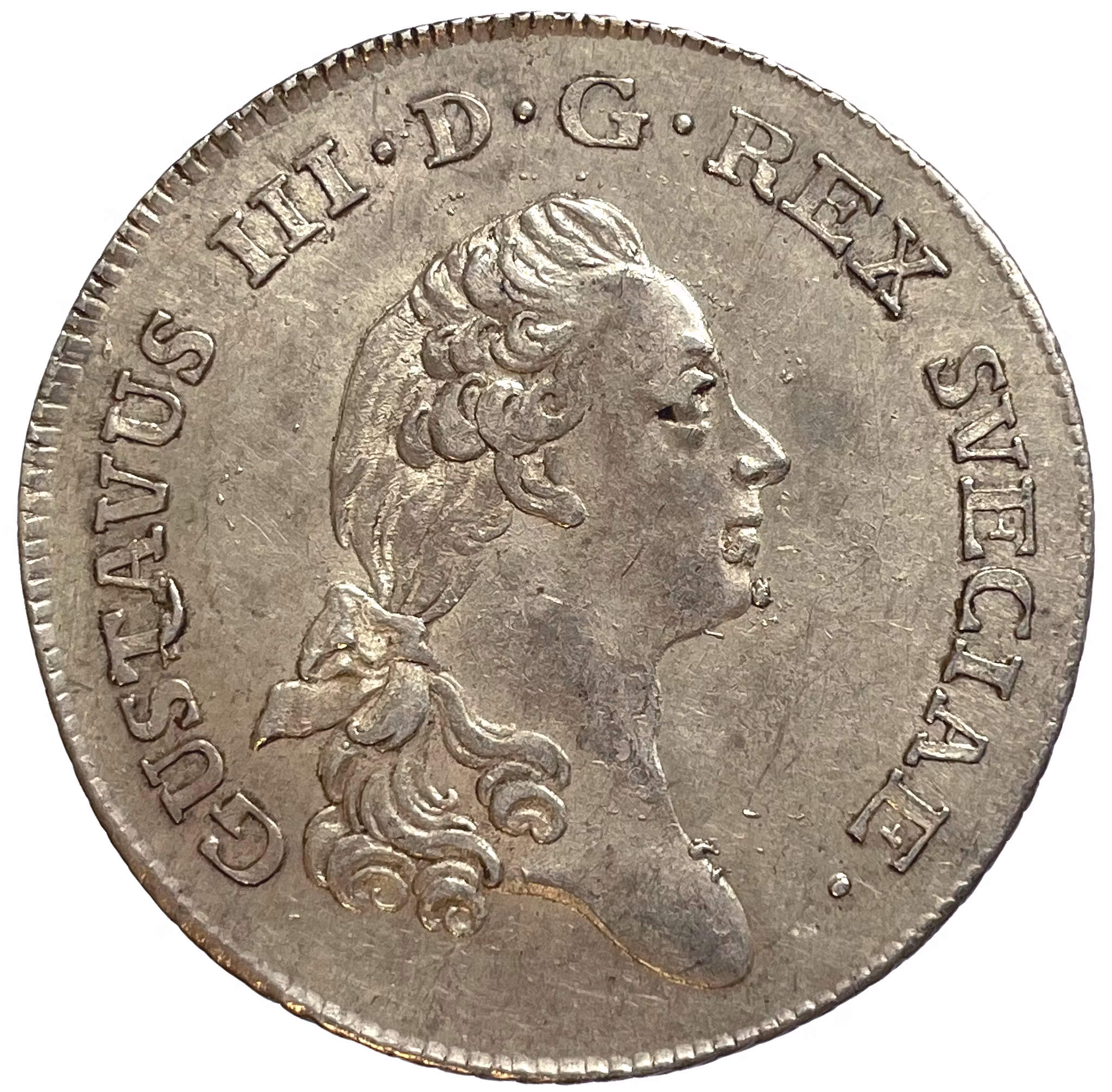 Gustav III - 1/3 Riksdaler 1789 med kort valspråk Produkten är tyvärr slut i lager. :( Gustav III - 1/3 Riksdaler 1789 med kort valspråkKvalitet 1+/01, SMB 59