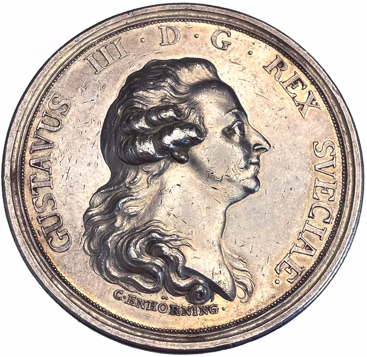 Gustav III:s högervänd bild med långt utsläppt hår och gravörens namn under bilden. I omskriften: "GUSTAVUS III D G REX SVECIAE"