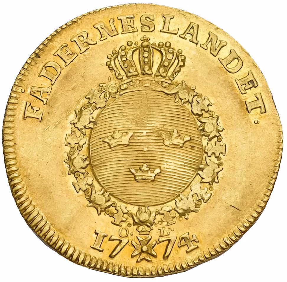 Ett unikt tillfälle för samlaren av extrema rariteter. Detta är inte ett så kallat årtalsmynt, utan en egen undertyp: Fehrmans dukater 1771–1773 har myntmästarmärke AL (Albrecht Lindberg), medan endast denna utgåva från 1774 bär myntmästarmärket OL (Olof Lidijn). Myntet med detta porträtt och myntmästarinitialer förekommer således enbart detta år och utgör en separat undertyp och blir på det viset extra attraktiv.