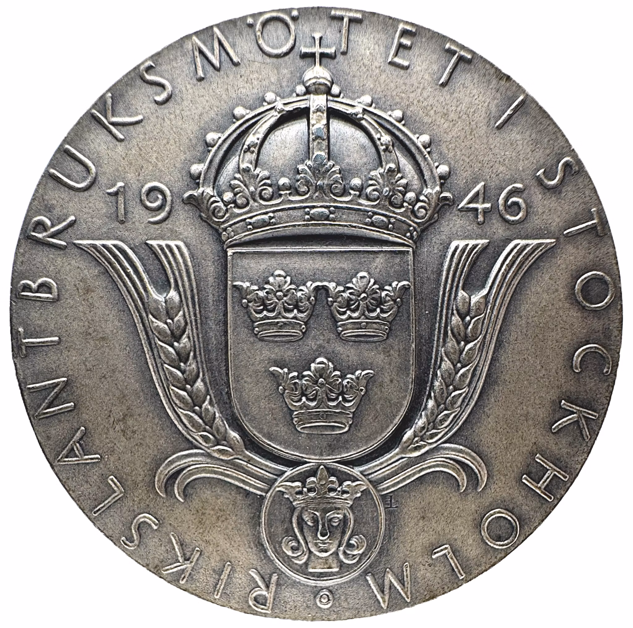 Silver, 25,42g, 39mm, Ulla Ehrensvärd 428, Kvalitet 01. På randen Sporrong och silverstämplar med årtalsstämpel U8 (1946). Erik Lindberg utarbetade sammanlagt tre olika skissförslag till medaljens frånsida, vilka han den 14 juni 1945 presenterade för Sporrongs. Det första utkastet föreställde en slät vapensköld med de tre kronorna, omgiven av vajande kornax både ovanför och nedanför skölden. Ur heraldisk synvinkel ansågs dock endast en mer återhållsam och stramare version godtagbar. Denna version, daterad juni 1945, granskades och vidimerades av J. Kleberg vid Riksheraldikerämbetet. Den definitiva beställningen tilldelades Lindberg den 25 juni 1945. Arbetet med frånsidans modell färdigställdes under hösten och levererades till Sporrongs den 3 december samma år. För åtsidan återanvände man det porträtt som Lindberg tidigare skapat för 1930 års lantbruksmöte. För sitt arbete erhöll han ett arvode på 600 kronor. Frånsidan, med en något omarbetad text, återanvändes senare vid lantbruksmötet i Jönköping 1959. Vid det tillfället sammanpräglades den hos Sporrongs med en åtsidesstamp graverad av Gösta Carell.