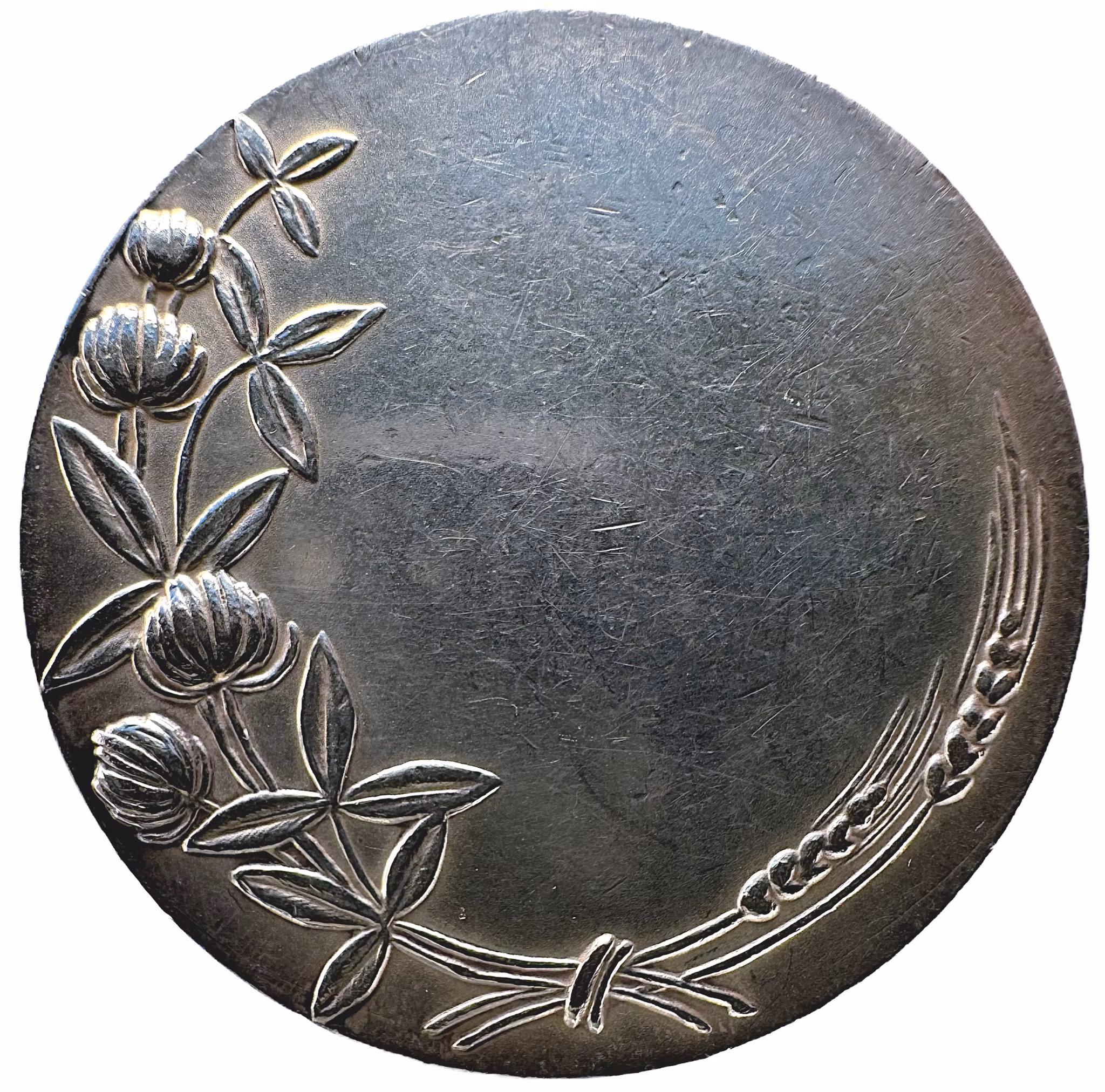 Till vänster ses en blommande växt med flera blad och knoppar. Nedtill binds växten samman med ett ax av säd, som löper upp längs medaljens högra kant. Plan yta i centrum avsedd för ingravering av pristagarens namn.