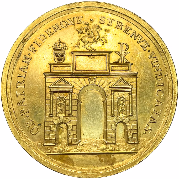 Konung Gustav Vasas fortsatta kamp för fäderneslandets befrielse från andligt och politiskt förtryck 1523. Karlsteens medaljer förekommer i silver och brons, undantagsvis i guld och i förgyllt brons. Detta läckra exemplar är i förgyllt brons och som sådant mycket ovanligt. Jag har endast noterat detta exemplar i min inventering. Åtsidan graverad 1699 och frånsidan 1700 efter Keders projekt. Hildebrand 5, Stenström 110. Kvalitet 01, 56g, 52mm