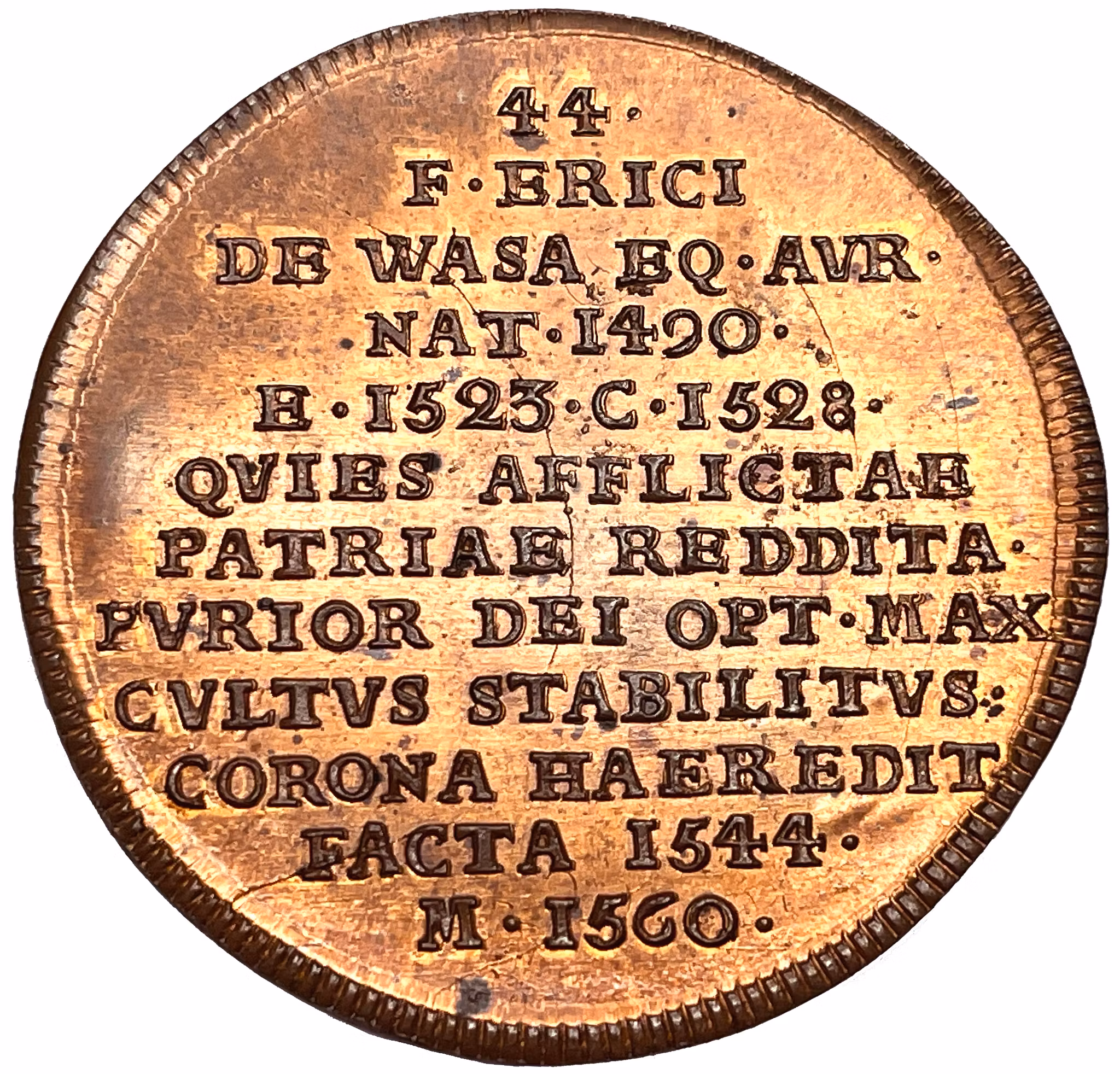 Text på tolv rader: "44. F. ERICI DE WASA EQ. AVR. NAT. 1490. E. 1523. C. 1528. QVIES AFFLICTAE PATRIAE REDDITA. PVRIOR DEI OPT. MAX. CVLTVS STABILITVS. CORONA HAEREDIT. FACTA 1544. M. 1560."