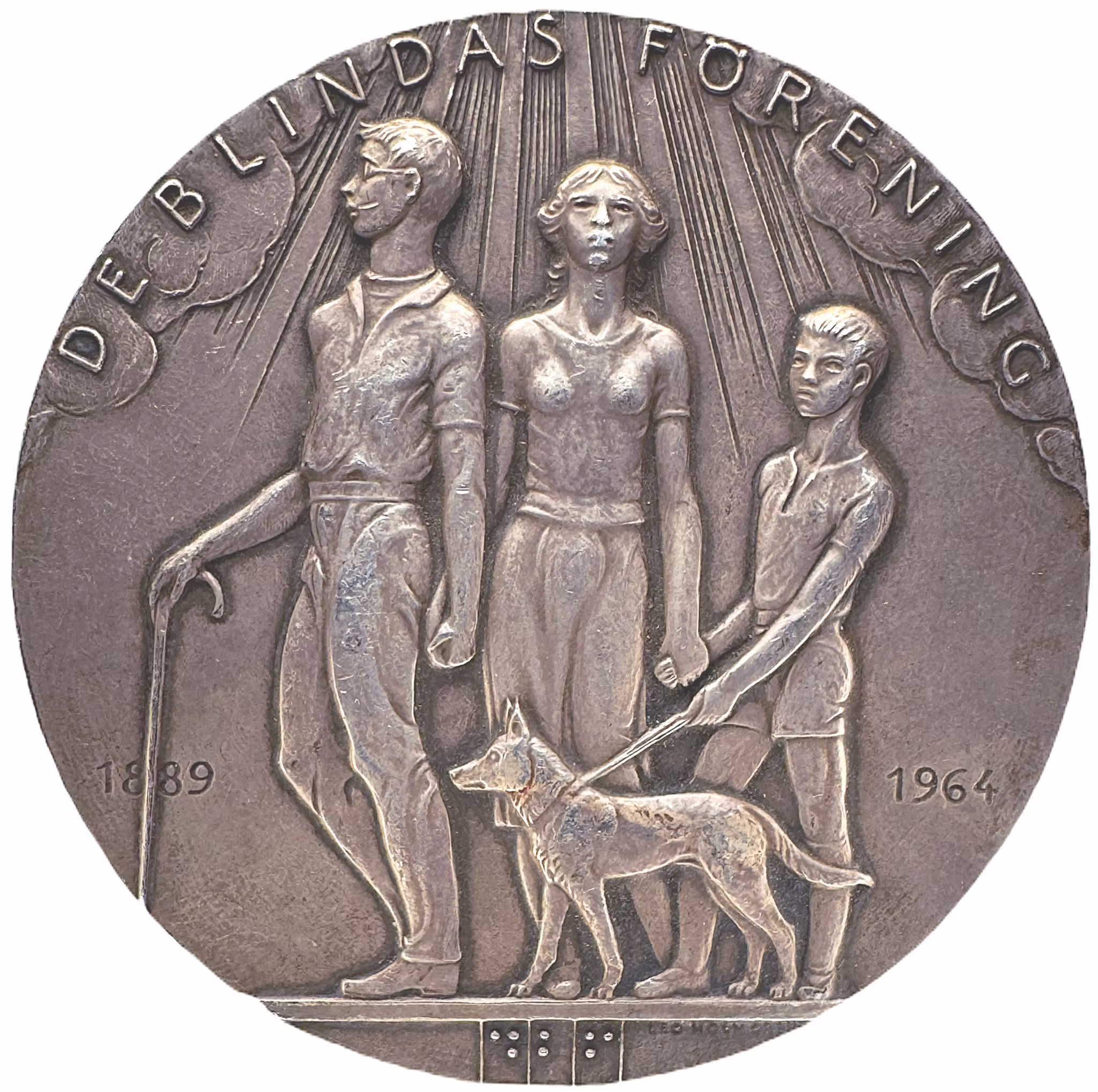 En familj av synskadade, man, kvinna och barn. Mannen med käpp och barnet med en ledarhund i koppel. I vänstra fältet årtalet för föreningens grundande 1889 och i det högra årtalet för 75-års jubileet, 1964. Överst: "DE BLINDAS FÖRENING". Nederst tre tecken blindskrift: "DBF"