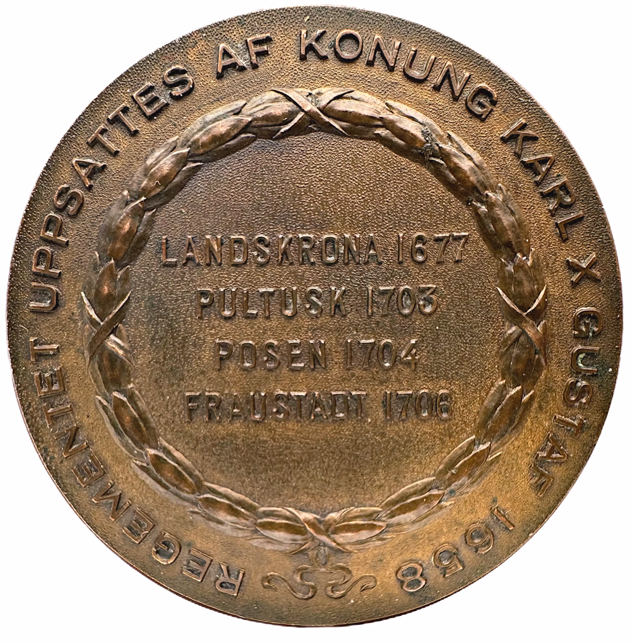 Baksidan berättar regementets ursprung och hedrar dess mest framstående insatser i fält. Yttertexten fastställer att regementet sattes upp av kung Karl X Gustaf år 1658, samma år som Skåne blev svenskt genom freden i Roskilde. Fältet i mitten, omgivet av en segerkrans, listar fyra av regementets viktigaste fansegrar: Landskrona under Skånska kriget, samt Pultusk, Posen och Fraustadt under Karl XII:s fälttåg i det Stora nordiska kriget: " LANDSKRONA 1677 / PULTUSK 1703 / POSEN 1704 / FRAUSTADT 1706". I omskriften: "REGEMENTET UPPSATTES AF KONUNG KARL X GUSTAF 1658"
