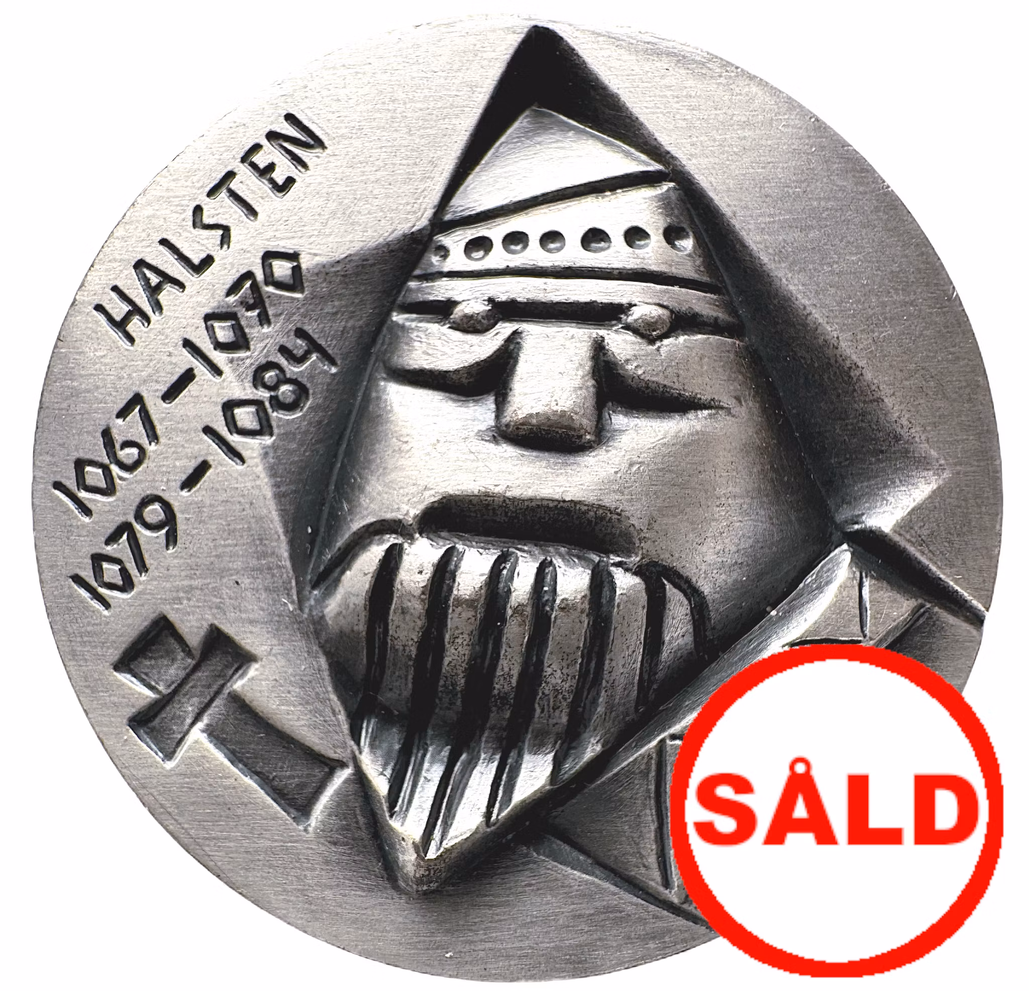 Medaljen över Halsten Stenkilsson fångar något av övergångstiden mellan hedendom och kristen kungamakt. På åtsidan syns ett stramt stiliserat ansikte, inramat av trianglar och kantiga linjer – som om motivet huggits ur sten snarare än modellerats i metall. Den kraftiga skäggkammen, det flacka hjälmpannbandet och korset nedtill antyder både den hedniske hövdingens kraft och den nykristne kungens tro. På frånsidan sitter en ensam gestalt med utsträckta armar på en högsätesten, omgiven av ett råd av små figurer. Ovanför står orden “LAND SKALL MED LAG BYGGAS” – en av Sveriges äldsta bevarade rättsmaximer. Medaljen berättar i metall den historia som nästan gått förlorad i tidens dimmor: om kung Halsten, son till Stenkil, som försökte skapa ordning genom lag där svärd och blodshämnd tidigare rått.