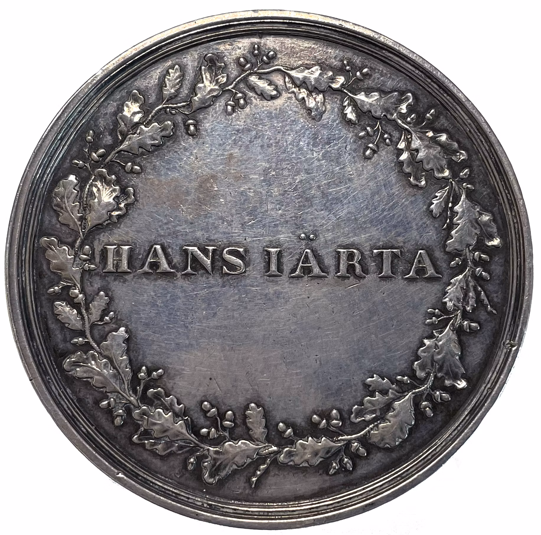 En extremt sällsynt medaljutgåva som är graverad av K.L. Lundberg och präglades i Berlin 1804 på uppdrag av Järtas politiska vänner. På åtsidan "HANS IÄRTA" inom en ekkrans och på frånsidan: "OB DEFENSOS CIVES MDCCC". Silver, 40.81g, 50mm, Hildebrand 337:1, Kvalitet god 1+, Mycket sällsynt, RR