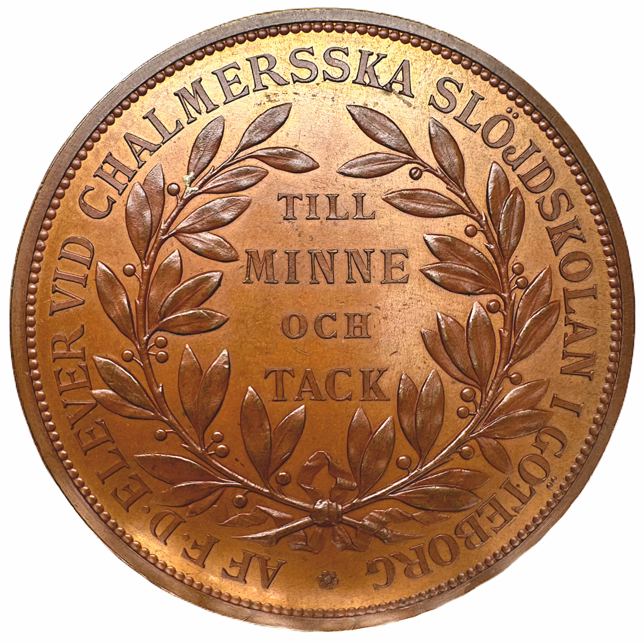 En krans av två korslagda lagerkvistar med text i centrum på fyra rader: "TILL MINNE OCH TACK ". I omskriften: "AF F. D. ELEVER VID CHALMERSKA SLÖJDSKOLAN I GÖTEBORG".