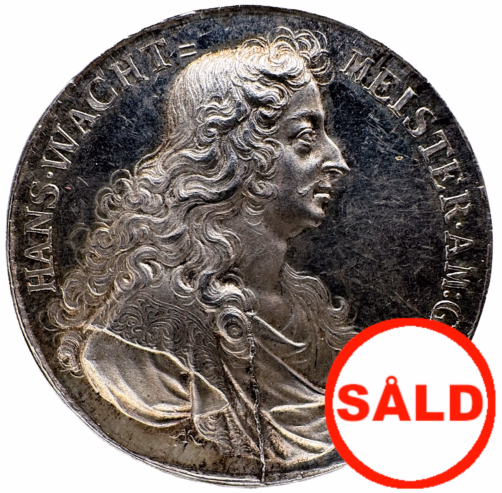 Silver, 25.13g, 40mm, Hyckert XVII:I:107-1, Ex. friherre Bondes samling på Ericsbergs slott, kvalitet 01+. Slagen efter 1678 (då Wachtmeister blev amiralgenerallöjtnant) och före 1681 (då han blev amiralgeneral). RR