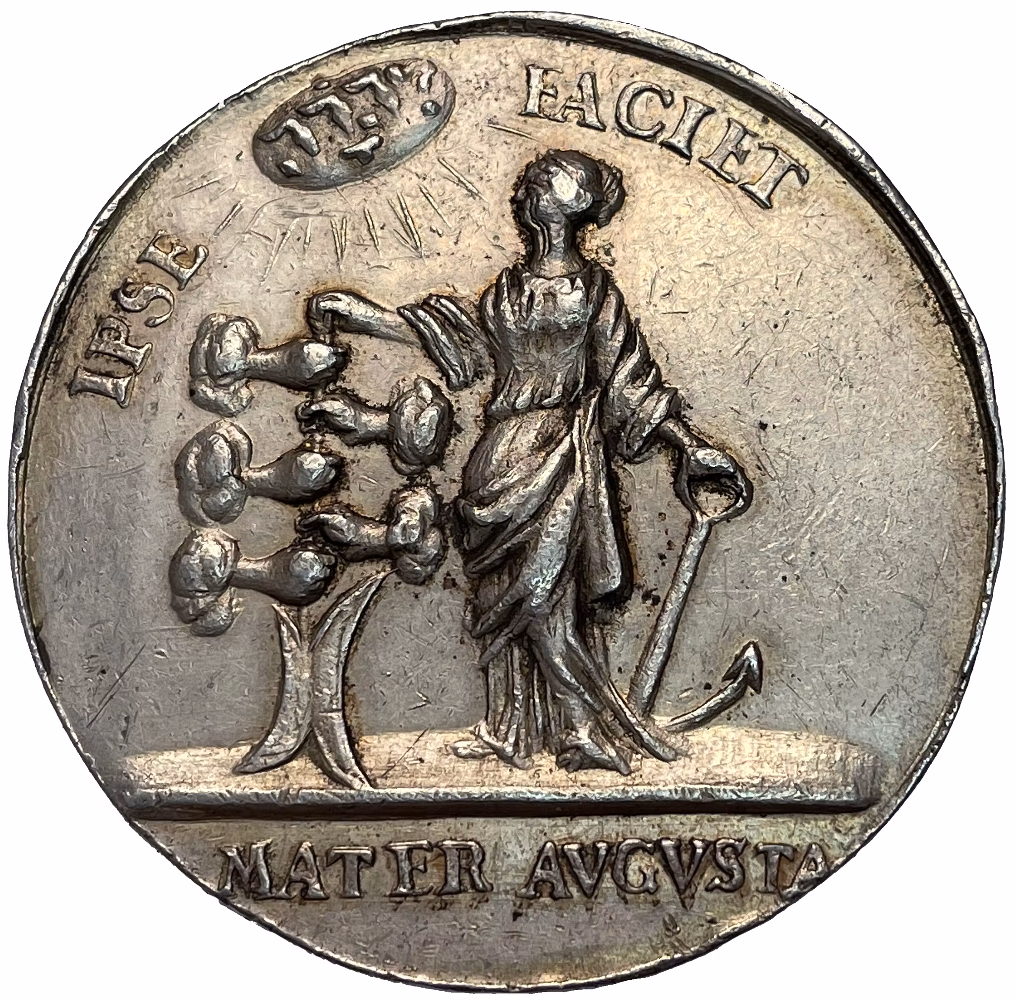 Änkedrottningen stående i antik dräkt, hållande ena handen överst på ett antikt roder, under hennes hand övriga händer utgörande förmyndarregeringens representanter. I den andra håller hon i ett ankare. Symboliken är tydlig, dels leder hon förmyndarregeringen det utgör henns person ankaret i i styrelsen. överst i bilden ett strålande jehova samt texten: "IPSE FACIET", i avskärningen texten: "MATER AVGVSTA". Hela texten översatt lyder: "Herren själv skall göra det. - Vördnadsvärd moder".