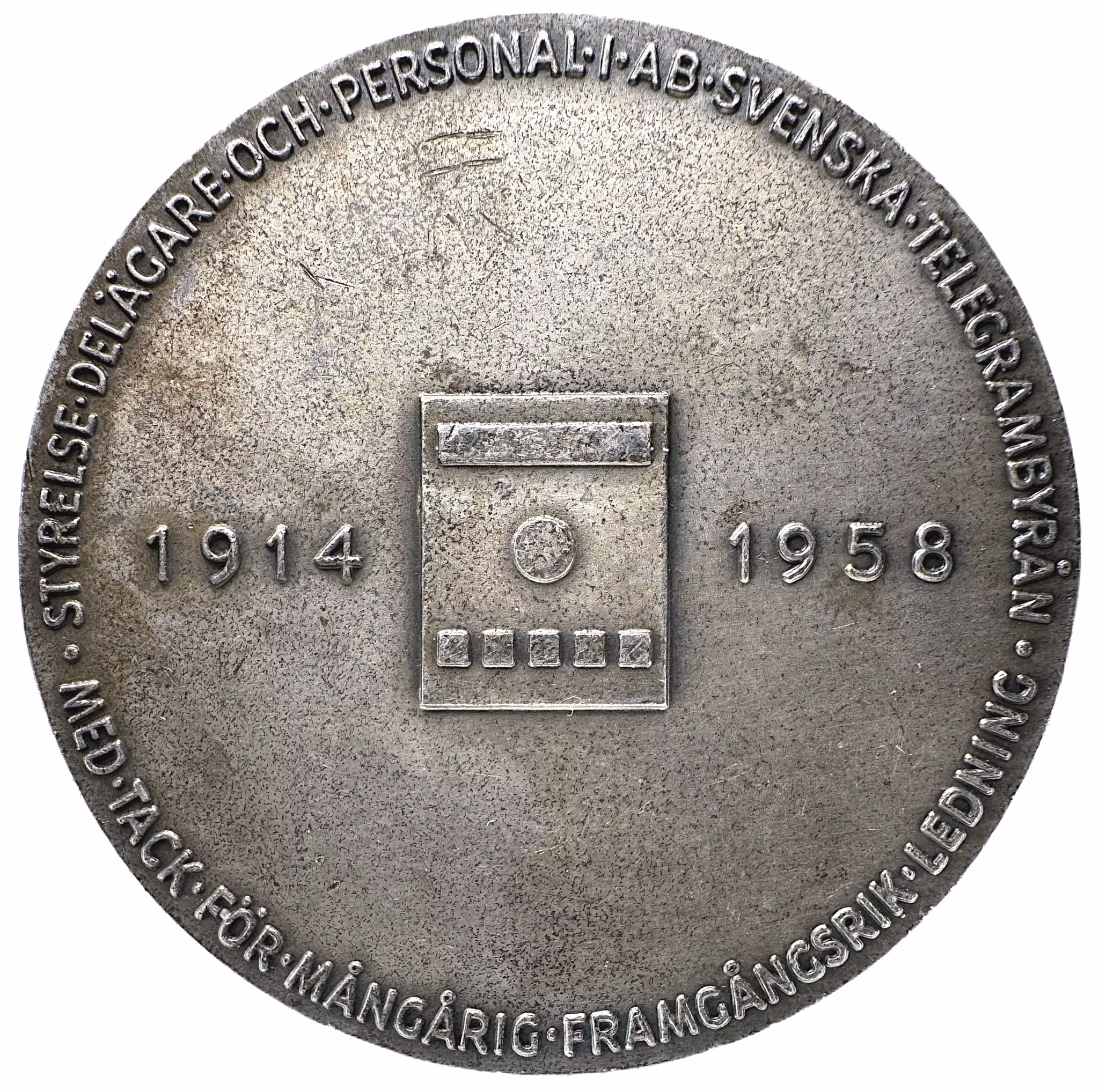 "STYRELSE·DELÄGARE·OCH·PERSONAL·I·AB·SVENSKA·TELEGRAMBYRÅN·1914·1958·MED·TACK·FÖR·MÅNGÅRIG·FRAMGÅNGSRIK·LEDNING", omslutande ett centralt emblem med en stiliserad bild som anknyter till företagets logotyp.