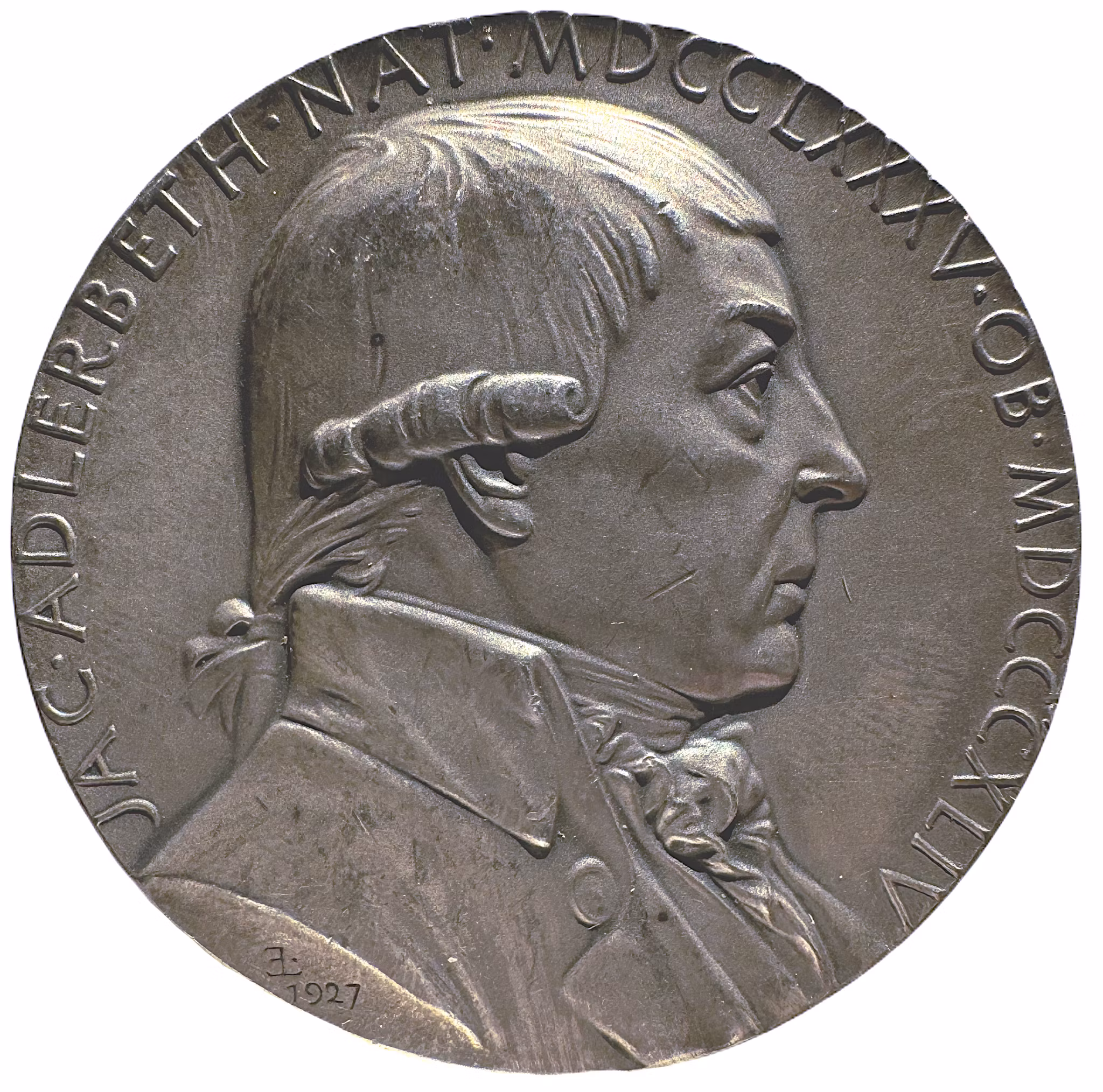 Adlerbeths högervända bröstbild, i ärmavskärningen gravörens monogram och årtal 1927. I omskriften: "JAC(obus) ADLERBETH NAT (us)