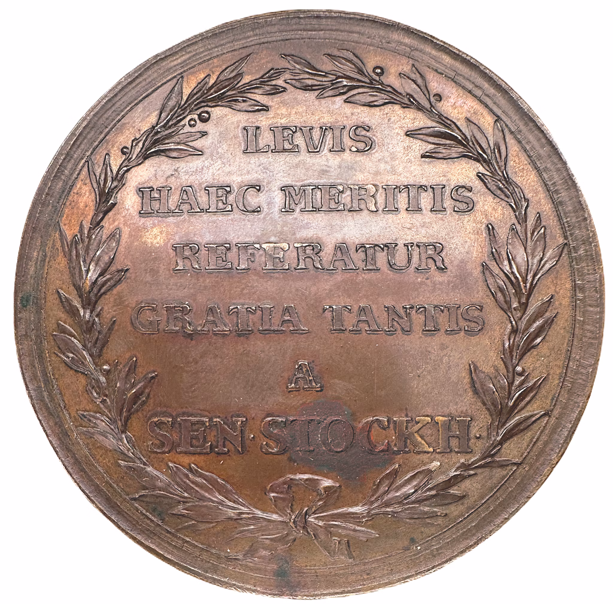Född i Reval den 4 november 1699. Svensk adelsman 1743. Friherre 1760. Landshövding i Göteborgs och Bohus län; Generallöjtnant; Kommenderande general och chef i Pommern; Överståthållare i Stockholm och ståthållare på Stockholms slott; Riddare och kommendör av Kunglig Maj:ts Orden. En härlig bronsmedalj i utsökt skick, präglad i hög relief med fullt bevarad präglingsglans och endast obetydliga kontaktmärken. Graverad av Gustav Ljungberger 1770. Utgiven på uppdrag av Stockholms magistrat. Hyckert I:218:1, 58.8g, 52mm, kvalitet god 01. Obetydlig fläck på frånsidan