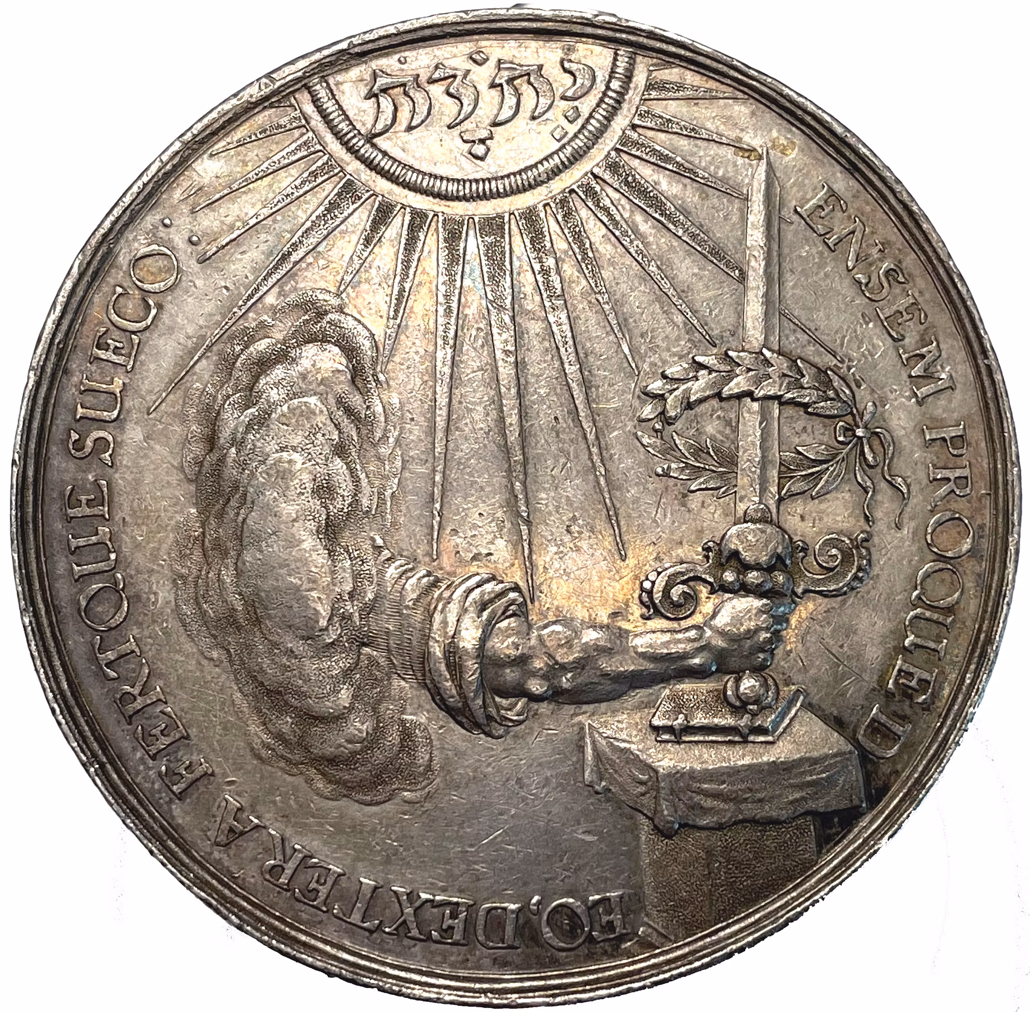 En halvnaken arm ur ett moln hållande ett upprätt svärd med fästeknappen stödd mot en på ett fyrkantigt bord liggande bibel. Kring svärdsklingan svävar en lagerkrans. Överst ett strålande Jehovah. I omskriften: "ENSEM PROQUE DEO, DEXTERA FERTQUE SUECO". Fritt översatt lyder texten: "Klingan istället för gud".