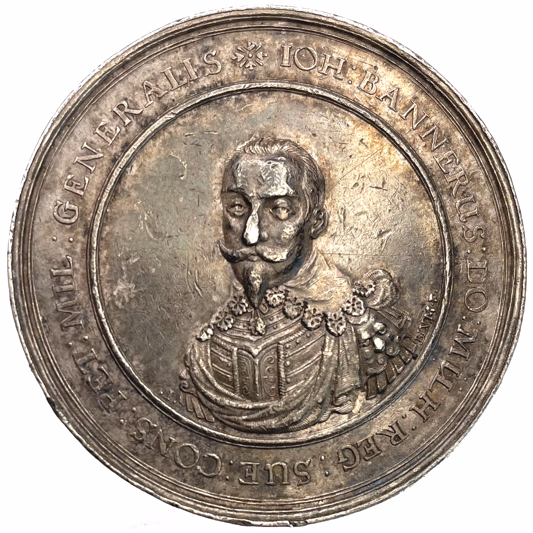 En synnerligen viktig och historiskt signifikant medalj öven Sveriges främsta krigargeneral. Vackert exemplar med en hel del bevarad, vackert skimrande prägligsglans. Medaljen är sällsynt och utöver det här utbjudna exemplaret har jag noterat fyra försäljningar i den internationella databasen Coin Archives Pro (där de flesta större auktionsföretagens resultat finns arkiverade). Som prisjämförelse såldes friherre Bondes exemplar av Künker och Nordlind 2008 i snarlik kvalitet (vz) 1800 Euro + provision (ca 22.000:-). Graverad av Johan Blum (ca 1632). Silver, kvalitet 1+/01, 34.84g, 45mm, Hyckert 23:1. RAR