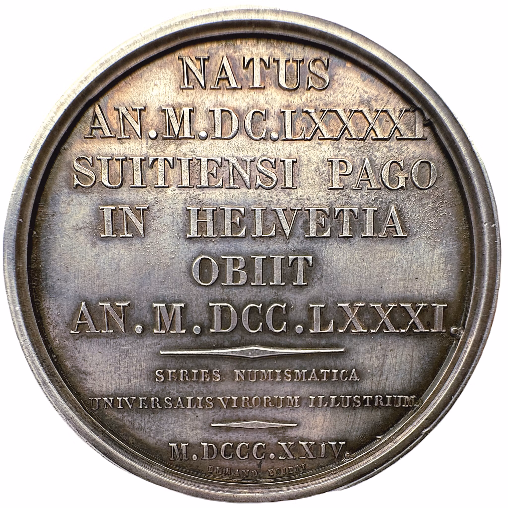 " NATUS / AN.MDCLXXXXI / SUITIENSI PAGO / IN HELVETIA / OBIIT / AN.M.DCC.LXXI / på sex rader ovanför en romblik linje, nedanför denna: "SERIES NUMISMATICA / UNIVERSALIS VIRORUM ILLUSTRIUM" på två rader ovanför en kortare romblik linje, nedanför denna präglingsåret: "M. DCCC. XXIV.", efter nedre kanten: "DURAND EDIDIT"