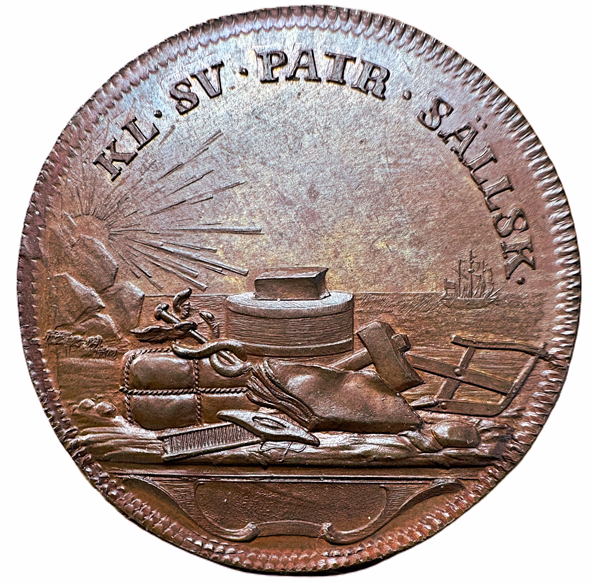 En grupp av symboler för handel, hantverk, bergs- och jordbruk (packås, kvicksilverstång, vävstol, skyttel, bok, kvast på sin stång, stångjärnshammare, plog) ordnad längs en strand. Till höger i bakgrunden syns den uppstigande, strålande solen bakom ett berg, medan det till vänster syns ett seglande skepp på havet. En enkel ornamentik bär upp avskiljningslinjen. Överst: "KL SV PATR SÄLLSK"