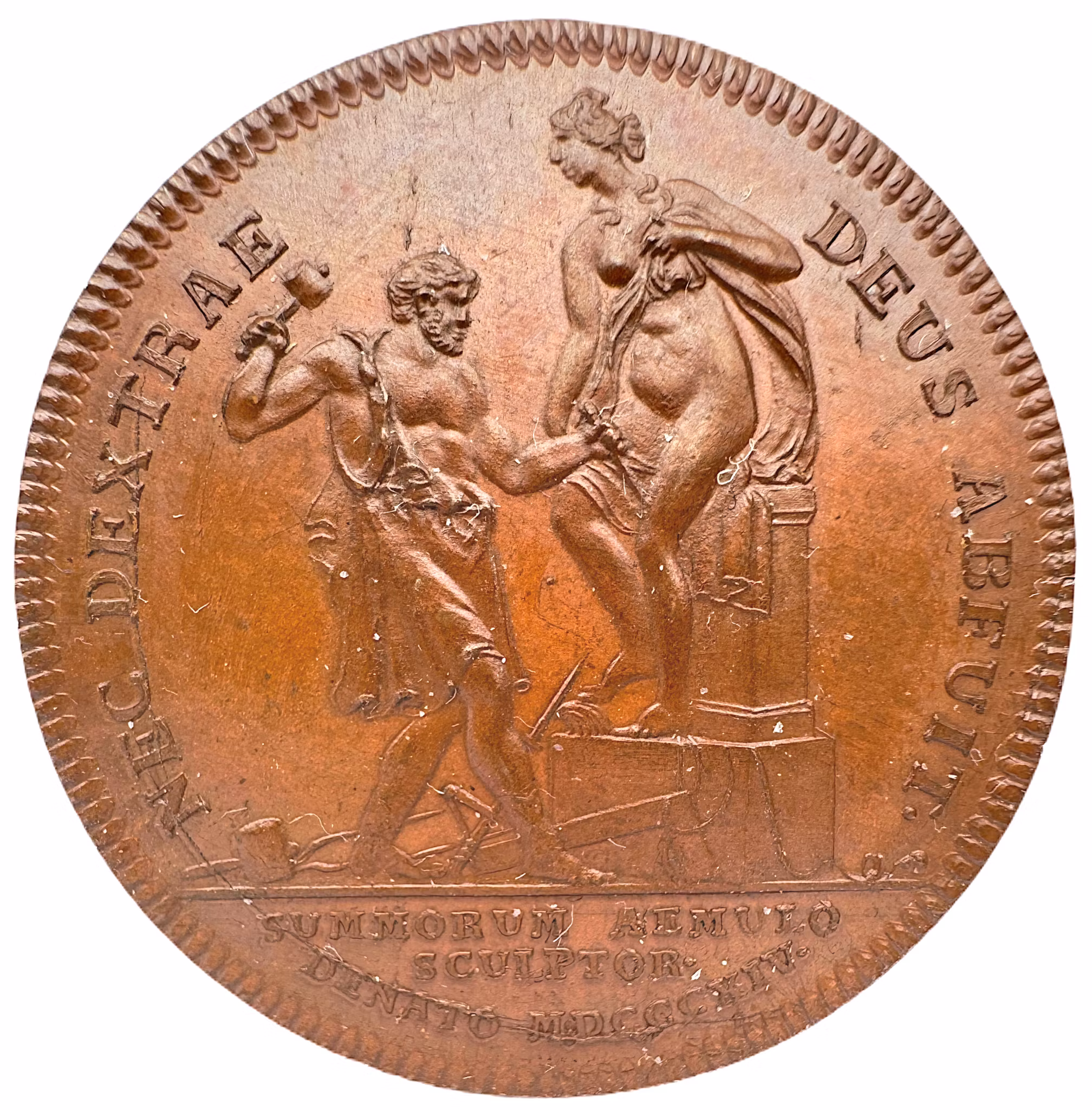 Pygmalion huggande på en bildstod. I omskriften: "NEC DEXTRAE DEUS ABFUIT" som översätts till: "'Snillets Gud övergav aldrig hans hand". I avskärningen på tre rader: "SUMMORUM AEMULO SCULPTOR DENATO MDCCCXIV", vilket översätts till: "'Åt den störste bildhuggares medtävlare, vilken avled 1814".