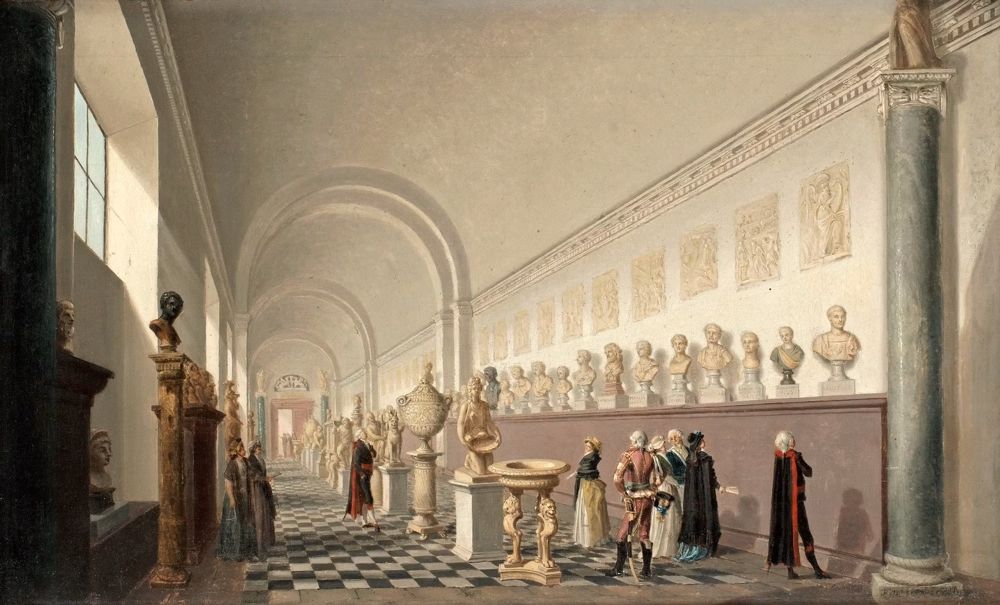 Detta nyöppnade museum förevigas av Pehr Hilleström (professor vid Konstakademien) i hans målning från ca 1795. Målningen visar ett av de långa gallerierna; ljus från höga fönster lyser upp det rutiga stengolvet och de välvda taken. Antika skulpturer står tätt längs väggarna och på piedestaler – byster, större figurer som Endymion, och urnor. Några elegant klädda besökare – kanske konstnärer, lärda eller hovfolk – vandrar genom salen och betraktar marmorföremålen.
