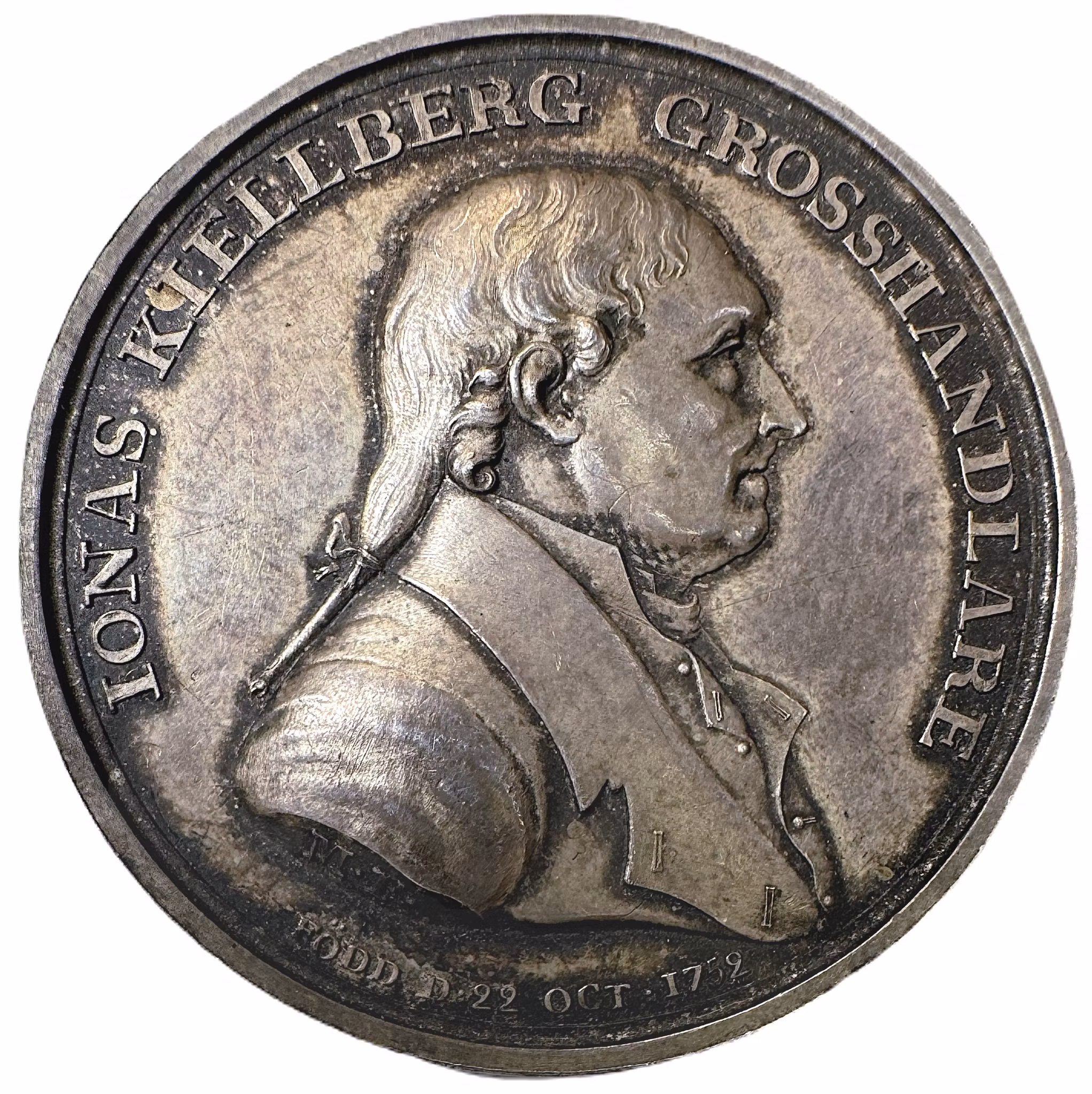 Kjellbergs högervända bröstbild, i ärmavskärningen gravörens initialer: "M•F•". I omskriften: "IONAS KIELLBERG GROSSHANDLARE". Efter nedre kanten: "FÖDD D•22 OCT•1752"