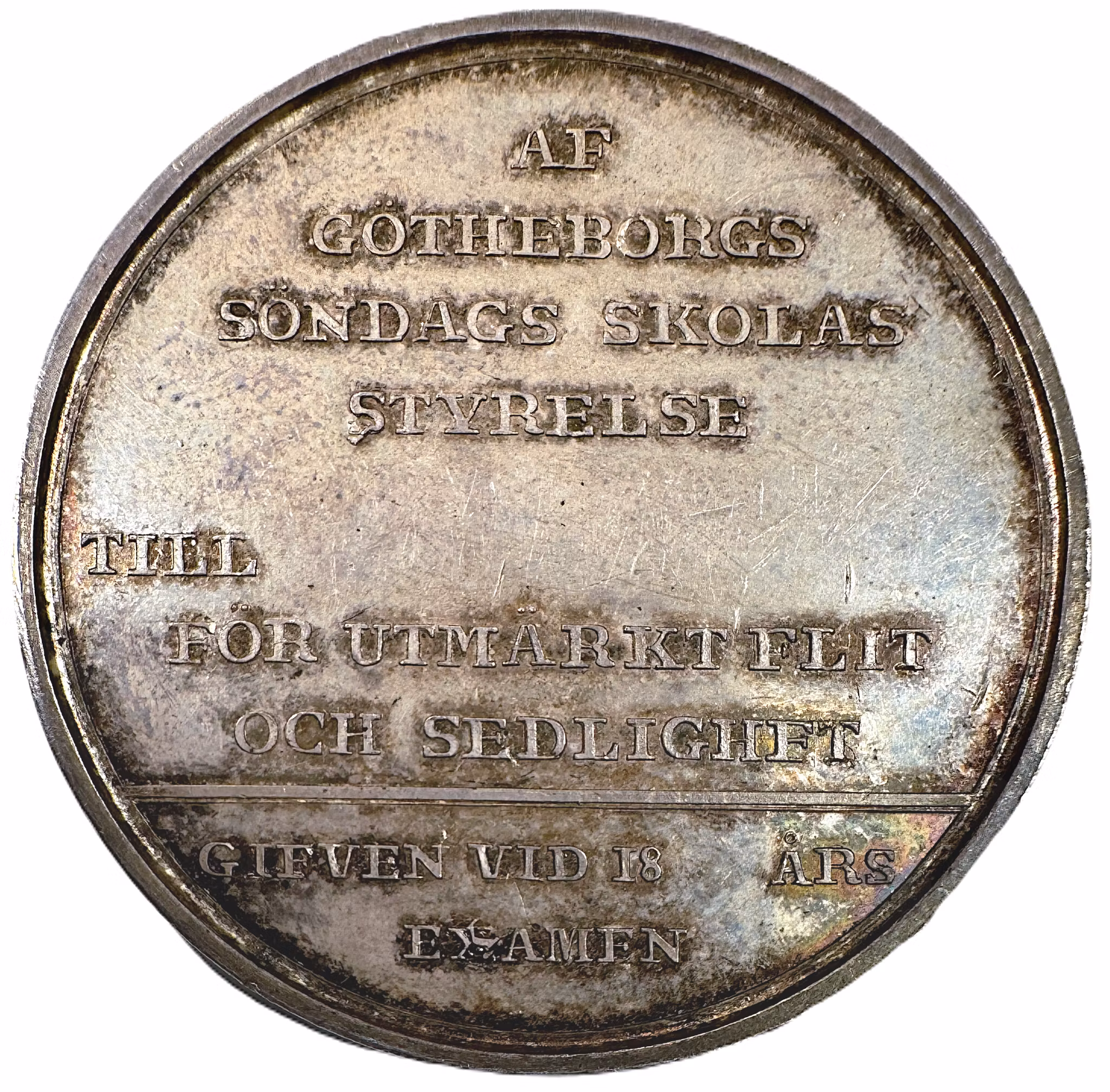 En vackert silvermedalj med härlig originalpatina, med endast obetydliga märken av hantering och lätt kabinettsslitage på de högsta partierna. Präglad på uppdrag av Göteborgs söndagsskolas styrlese, att utdelas till personer som deltagit i styrelsen. Av Mauritz Frumerie cirka 1828. Silver. 38.5 mm. 26.4g. Hyckert 2.87.2. Vacker patina och lyster. Kvalitet 01/0. Mycket sällsynt, RR.