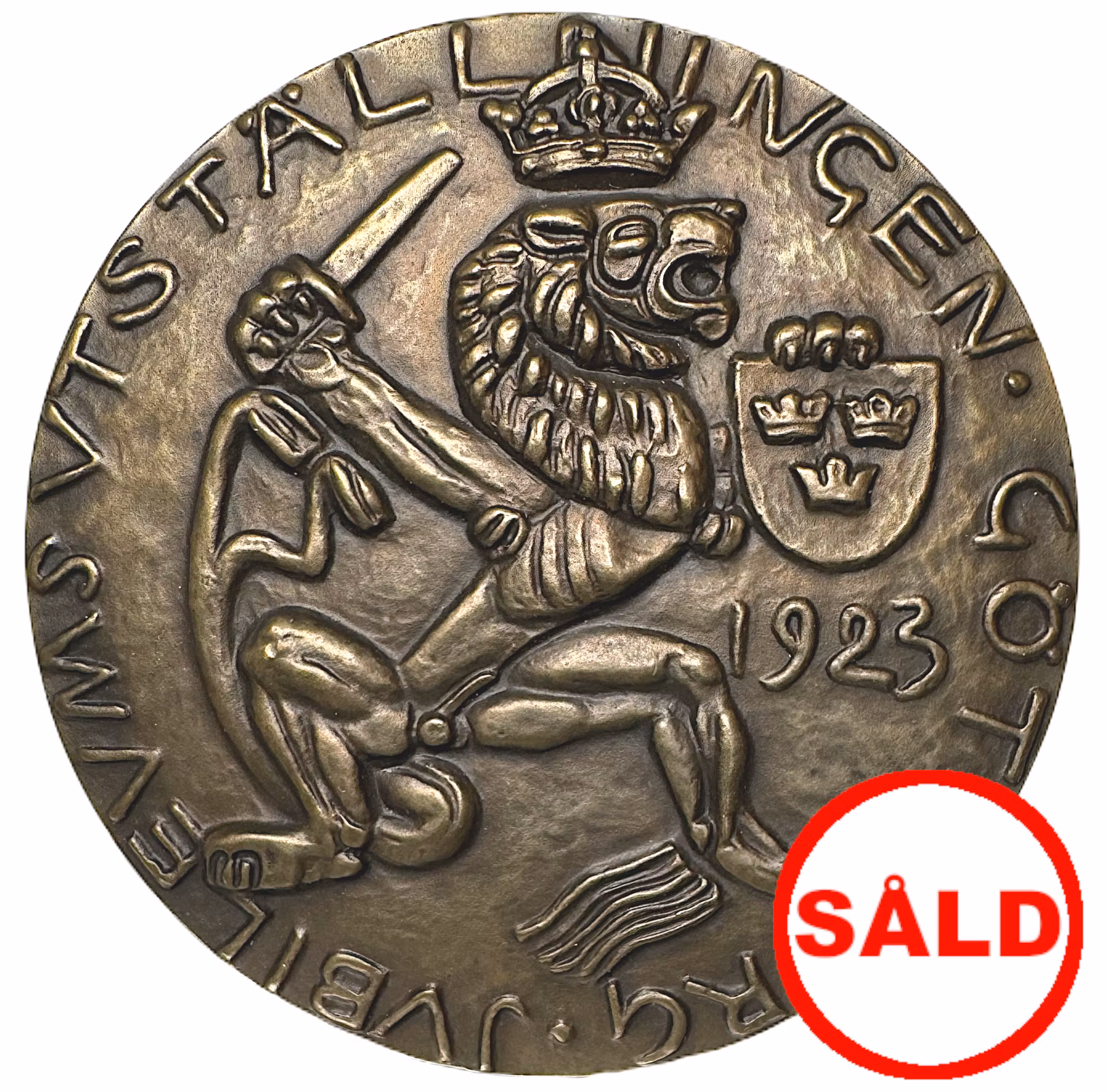 Ett krönt gående högervänt lejon bärande ett svärd och en vapensköld med tre kronor föreställande Göteborgs stadsvapen. Under skölden årtalet 1923 avseende utställningsåret. I omskriften texten: "JVBILEVMSVTSTÄLLNINGEN• GÖTEBORG"