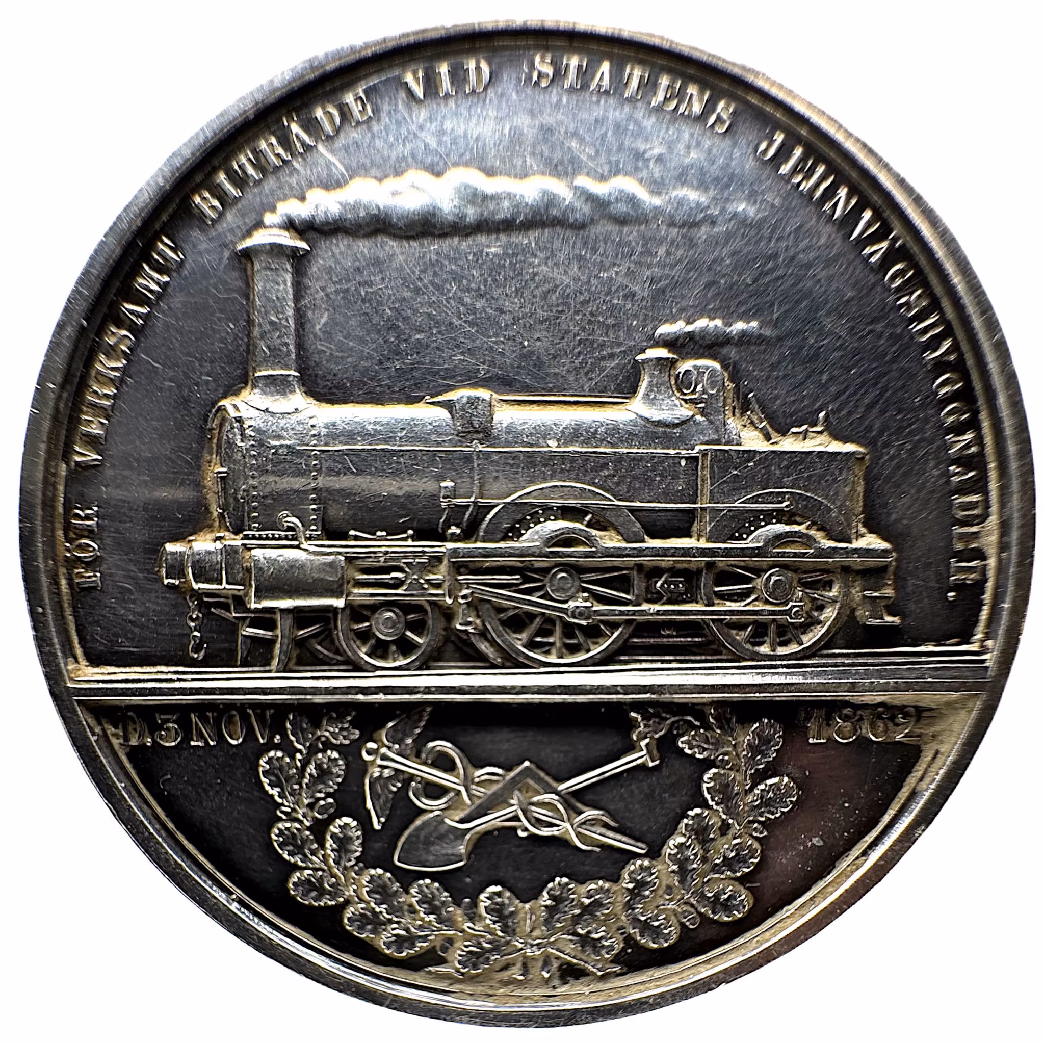 Ett rykande lokomotiv på järnväg. I avskärningen korslagd Merkuristav, spade och vattenpass inom en eklövskrans. I omskriften: "FÖR VERKSAMT BITRÄDE VID STATENS JERNVÄGSBYGGNADER, och i avskärningen: "D.3 NOV. / 1862."