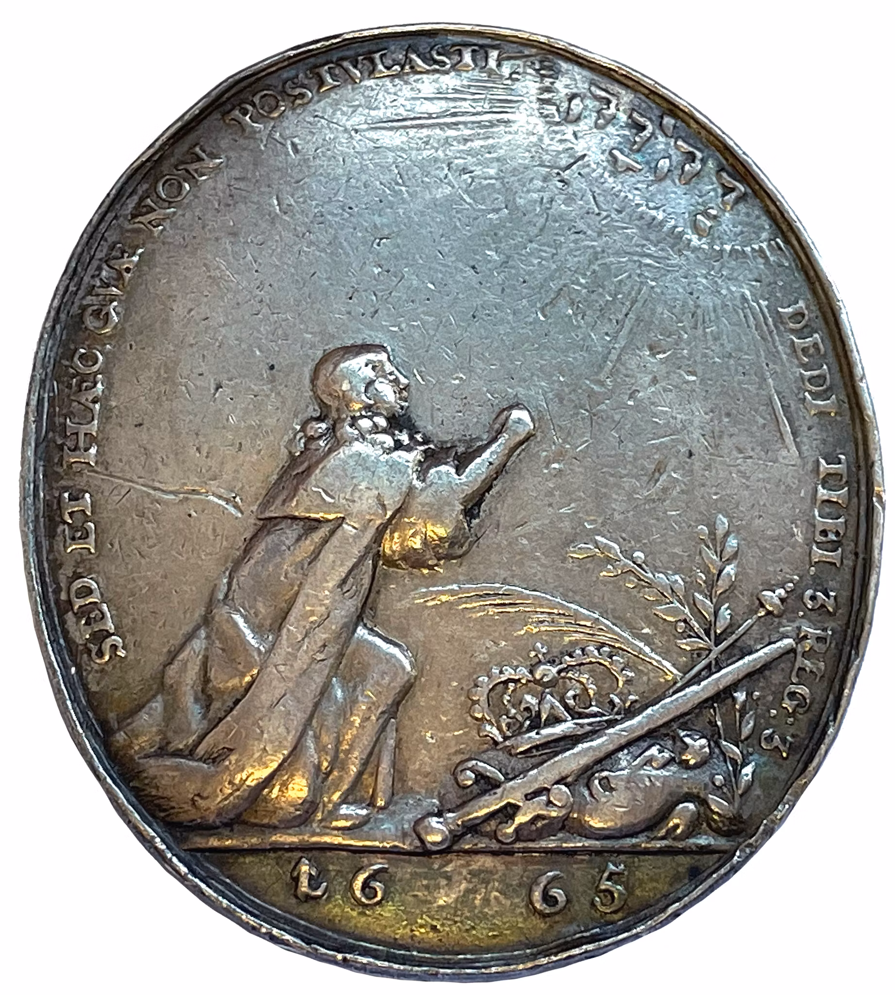 Konungen knäböjande under ett strålande Jehova, framför konungen ligger hans krona och svärd. I omskriften: "SED ET HÆC. QVÆ NON POSTULASTI. DEDI TIBI. 3. REG: 3." och i avskärningen årtalet: 1665". Omskriften i översättning lyder: "Men jag har givit dig även det som du inte har bett om. 1 Kon 3:13"