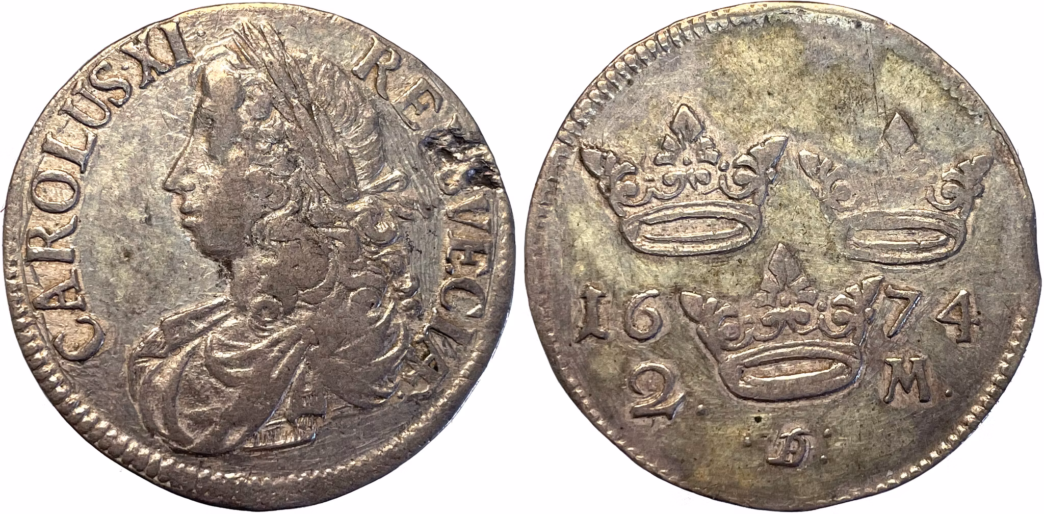 Karl XI, 2 Mark 1674 - Krontyp G4 - Ex. Kihlberg Produkten är tyvärr slut i lager. :( Karl XI, 2 Mark 1674 - Krontyp G4Ett tilltalande exemplar med uppgraverade fält och litet plantsfel i kanten. Krontyp G4, kvalitet 1+, SMB 206