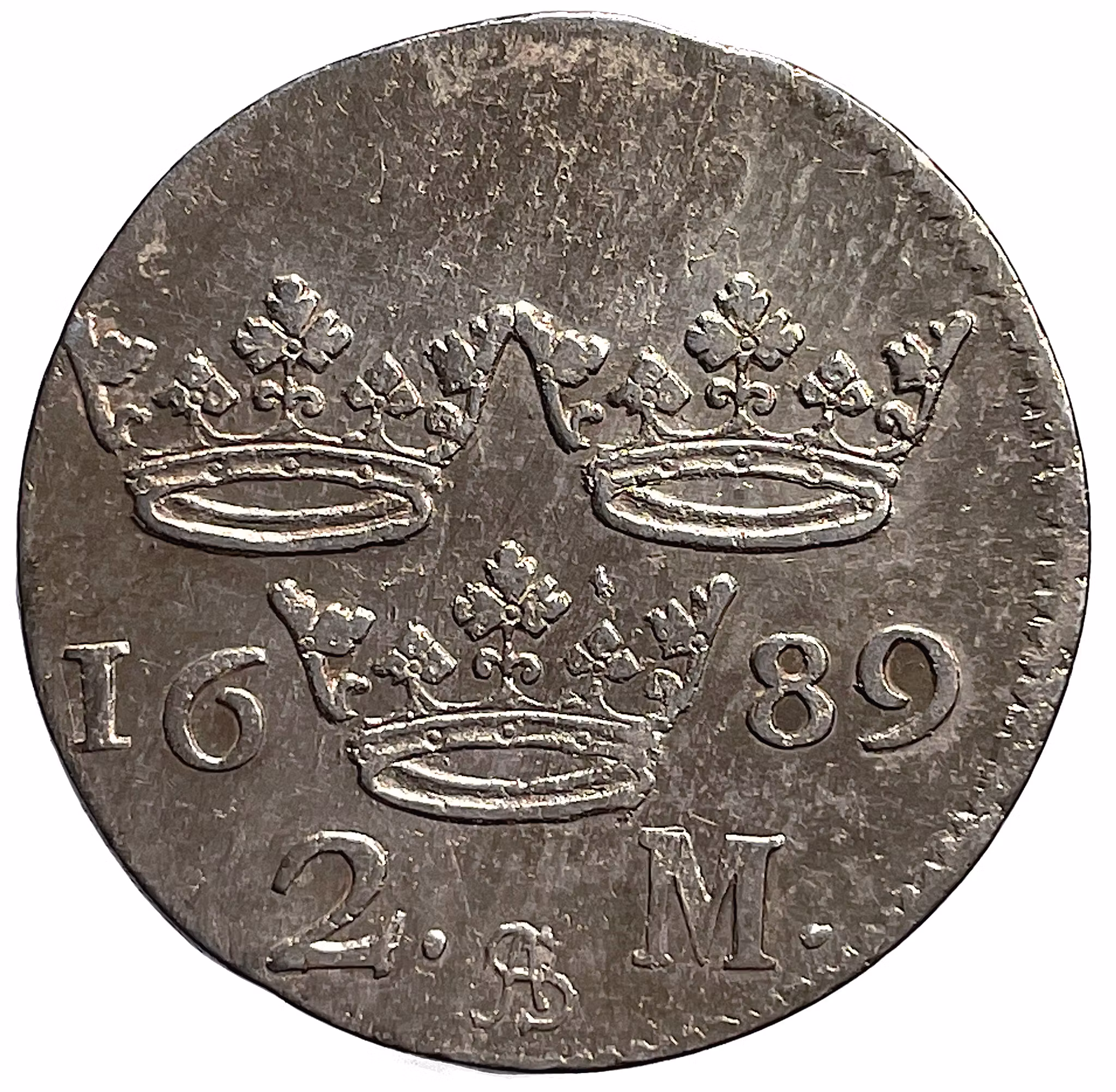 Karl XI, 2 Mark 1689 Ett Skarpt och tilltalande exemplar, obetydligt kantexemplar Produkten är tyvärr slut i lager. :( Karl XI, 2 Mark 1689Ett Skarpt och tilltalande exemplar, obetydligt kantexemplar. Kvalitet 1+/01, SMB 23