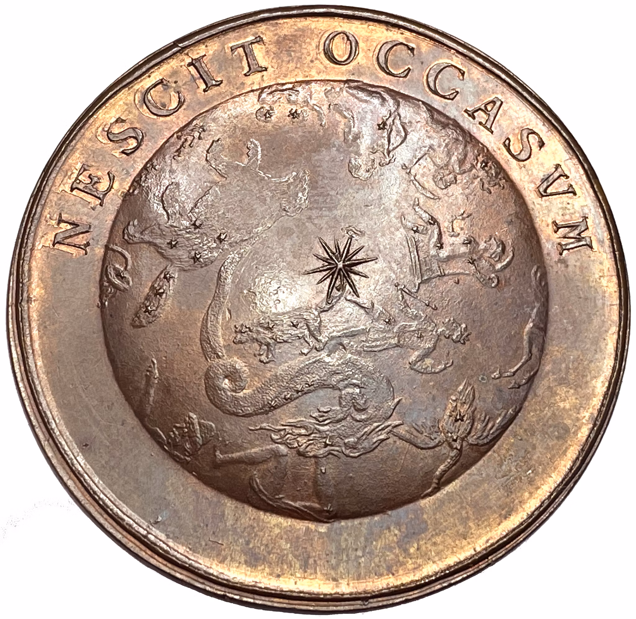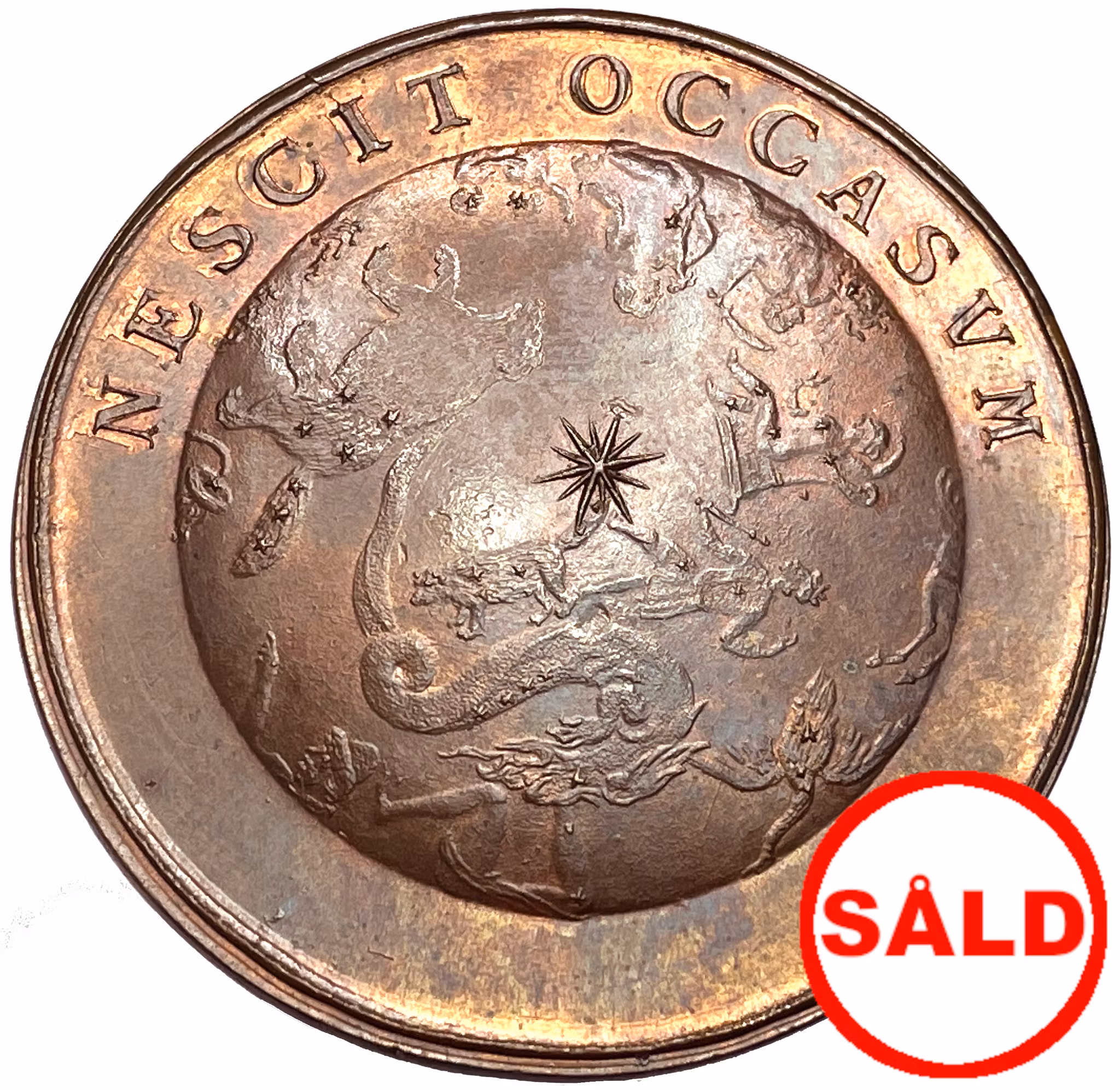 Nordstjärnan strålande klart på natthimlen, placerad mellan Stora- och Lilla björn. I omskriften: "NESCIT OCCASVM" som översatt lyder: "Den känner inte till någon nedgång".