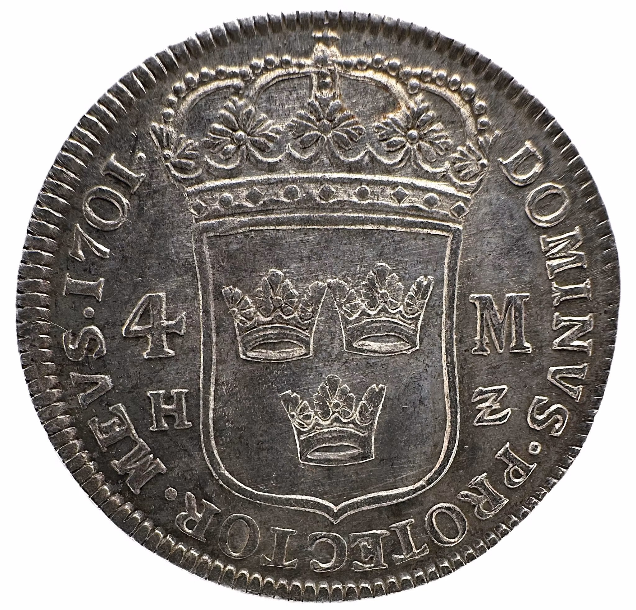 Det är i detta segerrus som detta silvermynt, en 4 Mark, präglades år 1701. Vid denna tidpunkt stod Sverige på kulmen av sin militära makt. Karl XII, nu nitton år gammal, hade riktat sitt fulla fokus mot August den starke. Sommaren 1701 ledde han personligen sin armé i en djärv flodövergång vid Düna i nuvarande Lettland. Den 9 juli drabbade de samman med en saxisk-rysk styrka och tillfogade dem ett förkrossande nederlag. Segern vid Düna öppnade vägen in i Polen och Litauen, och den svenska armén framstod som oövervinnelig. Detta mynt var en del av den krigsekonomi som finansierade dessa fälttåg – en materiell manifestation av rikets makt, präglad i silver och buren i soldaternas och medborgarnas pungar.