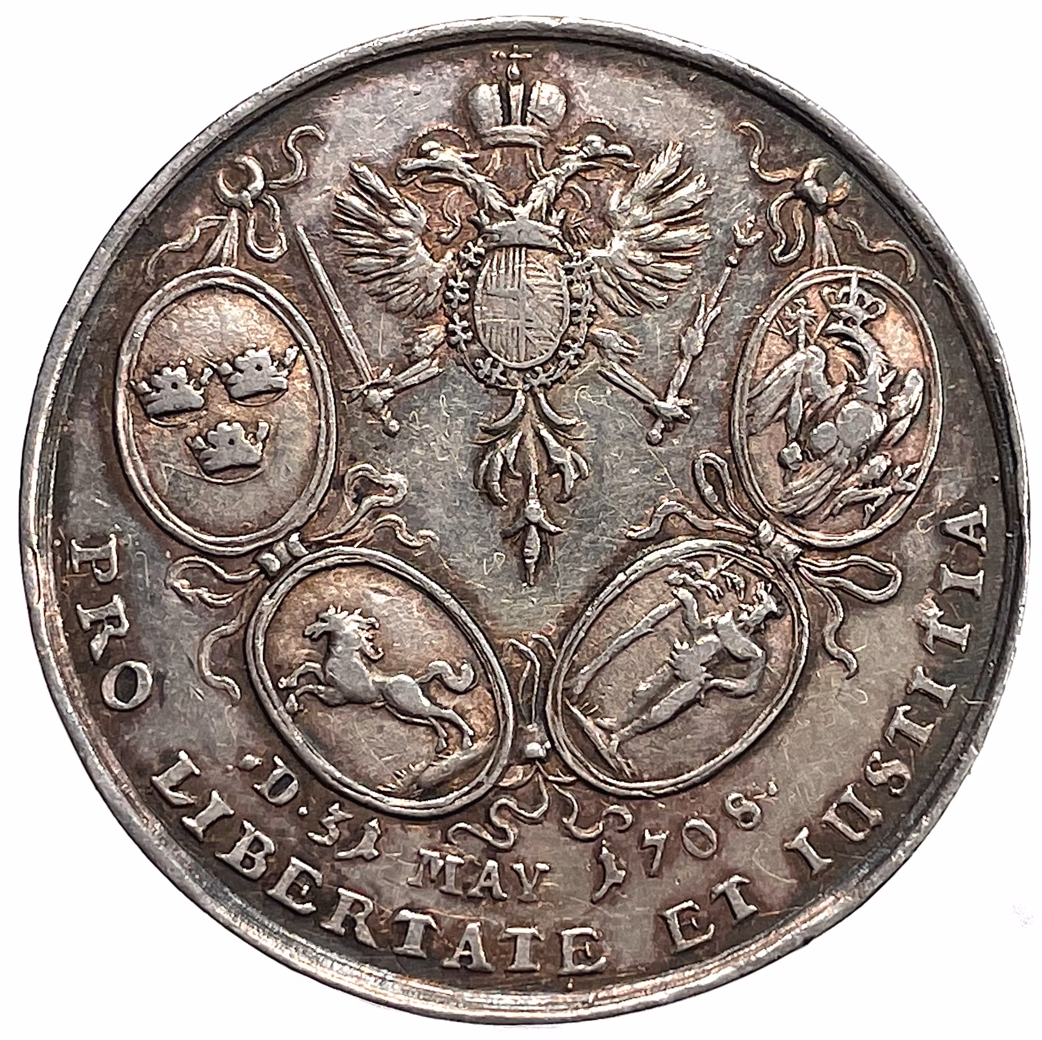Överst Tyska riksörnen, därunder, hänger på ett band, fyra ovala sköldar innehållande Sveriges och de tre övriga förbundsmakternas vapen. Text längs kanten och nedtill: "PRO LIBERTATE ET IUSTITIA / D•31 MAY 1708•"