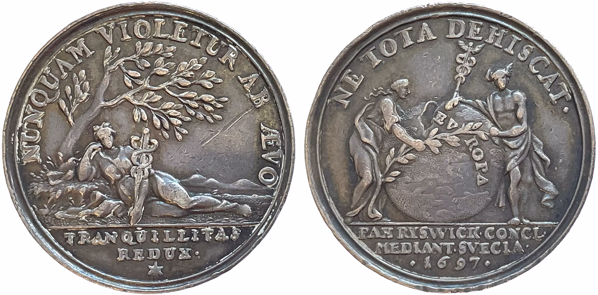 Fredsgudinnan och Merkurius, stående, bemöda sig att med en olivkvist ombinda det rämnade jordklotet, på vilket läses "EVROPA". I omskriften: " NE TOTA DEHISCAT." och i avskärningen: "PAX RYSWICK. CONCL. MEDIANT. SVECIA. .1697." Hela texten lyder översatt: "För att den inte skall spricka hel och hållen. - Fred slöts i Ryswik under förmedling av Sverige."
