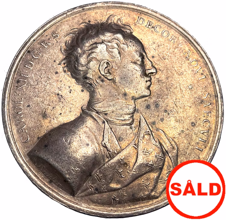 En historiskt signifikant krigsmedalj från en av vår tids största medaljsamlingar, greve Bonde på Ericsberg. I den internationella databasen Coin Archives Pro (där de flesta större auktionsföretagens resultat finns arkiverade) har under de senaste ca 20 åren fyra exemplar, inklusive det här erbjudna noterats. Det här utbjudna exemplaret ingick sålunda i greve Bondes samling som såldes 2010 med objektsnummer 331. Medaljen saknades i den del av Sven Svenssons samling som såldes 1966 och 1970 av Hirsch Mynthandel. Ett exemplar i kvalitet 1+ ingick Sune Eberhard Cronas samling som såldes av Felix Schlessinger i Amsterdam 1937 med objektsnummer 443. Cronas exemplar var dock ej avbildat och troligen är det ett av de senare noterade exemplaren. Graverad av Bengt Richter (Elev till Arvid Karlsteen). Kvalitet 1+, R, Silver, 104.58g, 60.4mm. Hildebrand 68.