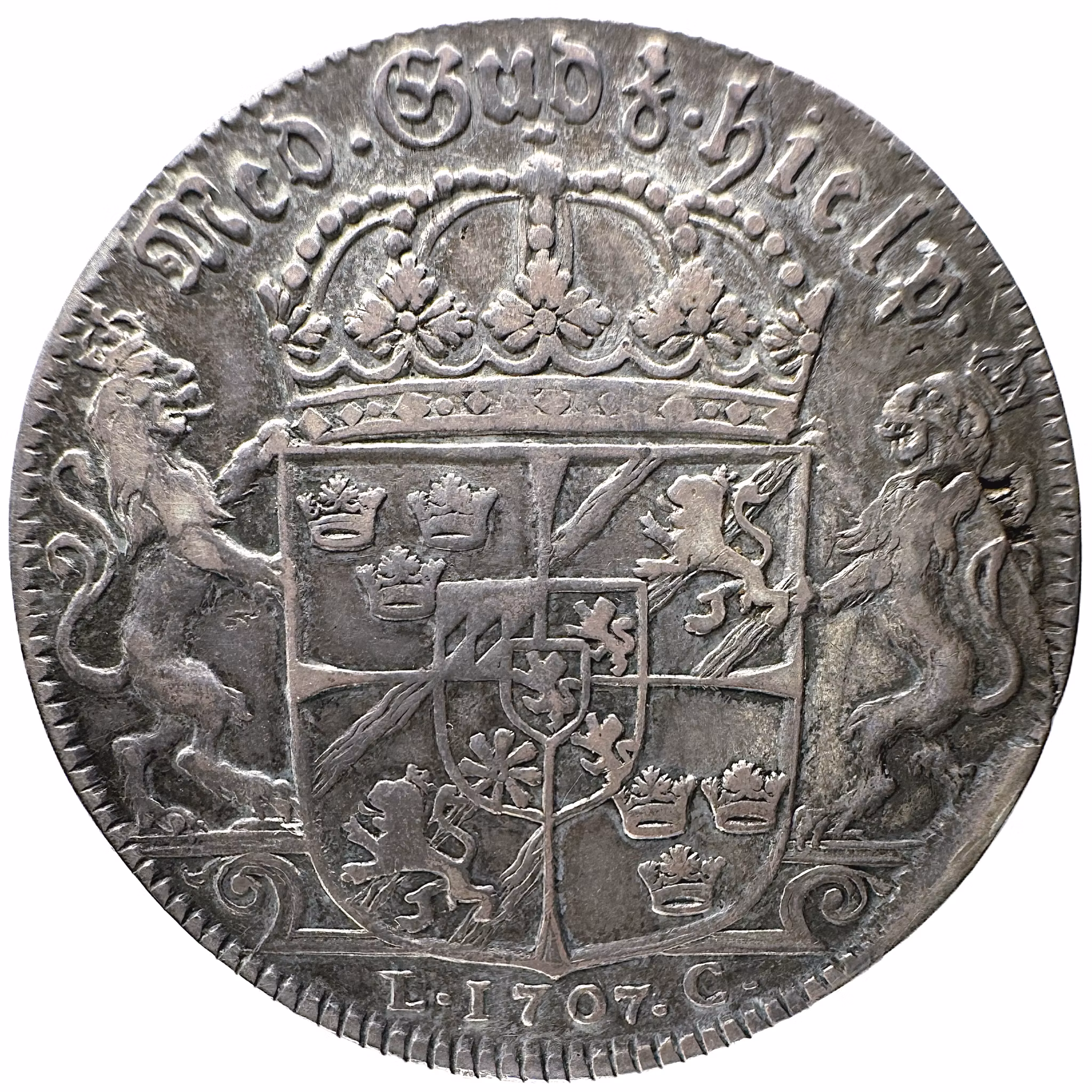 Denna riksdaler från 1707 representerar därför den sista stunden av relativt lugn före stormen. Den symboliserar ett Sverige som fortfarande var en obestridd stormakt, vars ekonomi kunde upprätthålla silvermyntfot och vars kung kunde forma Europas politik. Kungens valspråk, "Med Guds hielp", som kröner riksvapnet på myntets frånsida, hade fram till nu visat sig vara en segerformel. Men inom två år skulle den svenska armén krossas vid Poltava och kungen tvingas i landsflykt. Stormaktens öde vände. Detta mynt är ett minne från ögonblicket precis innan allt stod på spel.