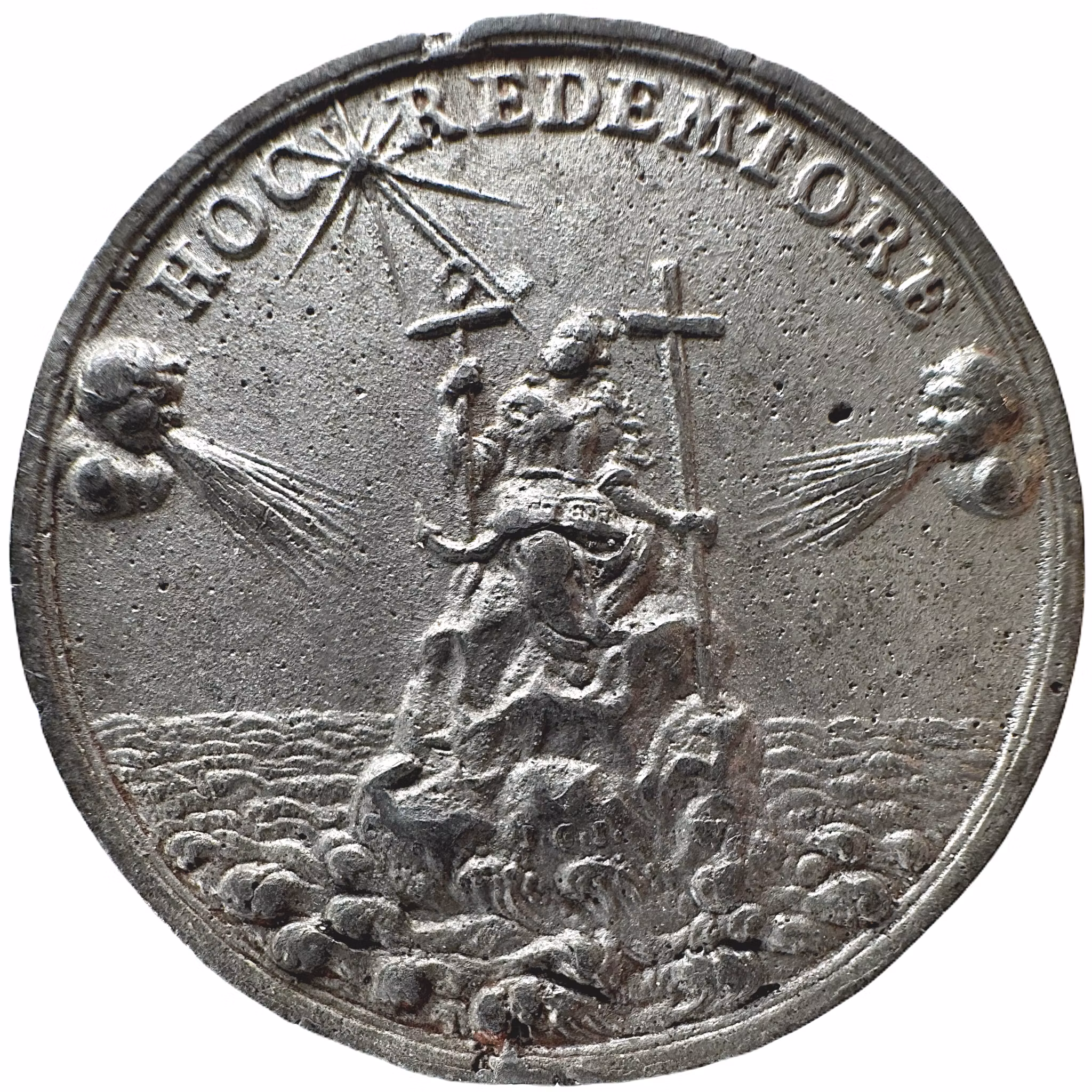 En kvinna (Religionen), med ankare och korsstav i händerna, sitter på toppen av en ur det svallande havet uppskjutande klippa, tittande upp mot nordstjärnan. På hennes knä ligger en uppslagen bok med skrift på bladen. Text överst: "HOC REDEMTORE• / (text på bok) "BIBLIA" / (På klippans kanter) "C. I. G.I. W." ("Genom denne frälsare")