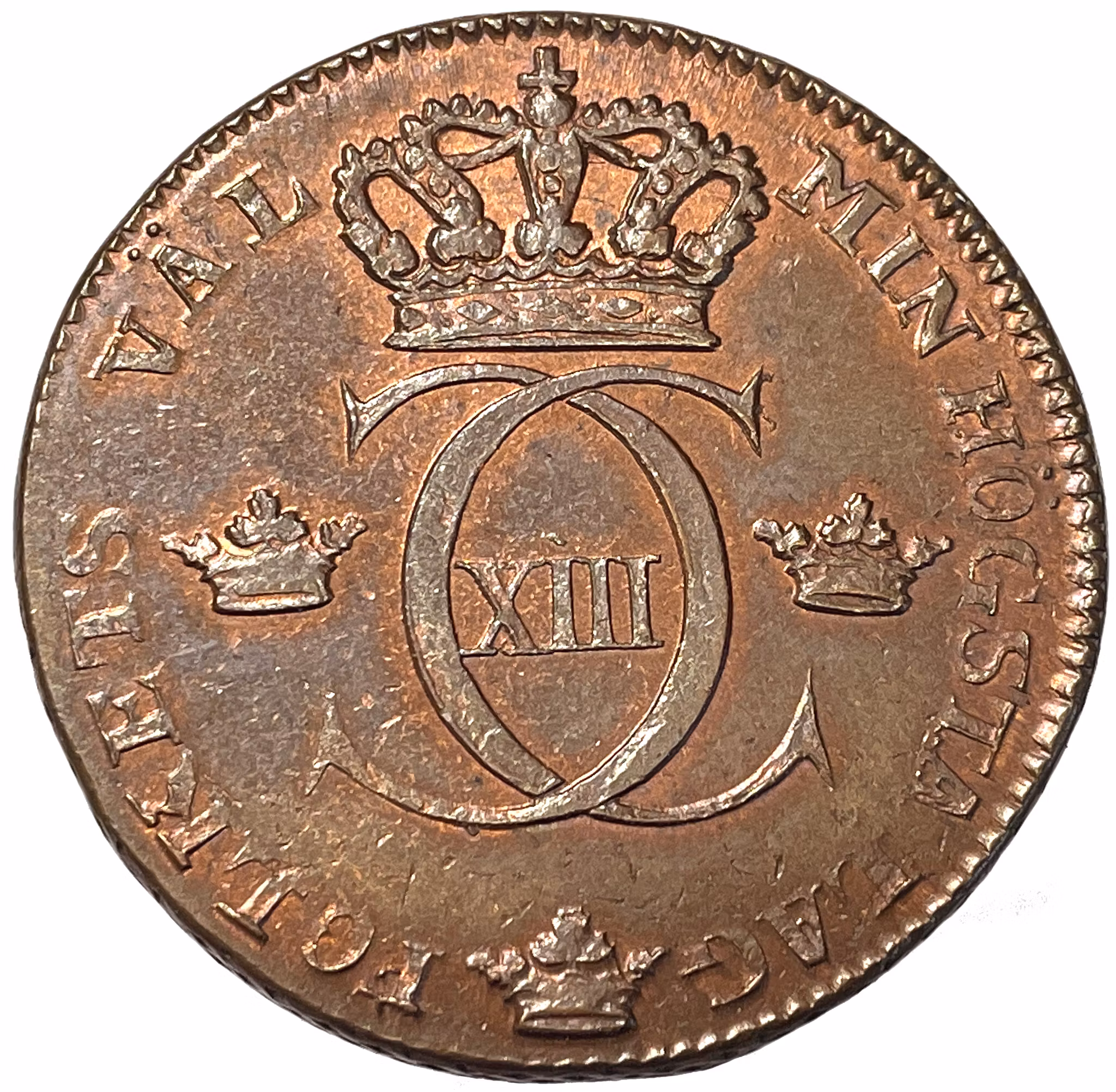 Vackert ocirkulerat exemplar med mycket röd präglingsglans. Viss sedvanlig delvis svag utprägling och sk tumlingsmärken efter rengöringsprocessen av myntämnena som tumlades rena i en trumma inna präglingen. Ett intressant och pedagogiskt exempel av tillverkningsprocessen som sällan är omnämd i litteraturen. SMB 35, kvalitet 01/0