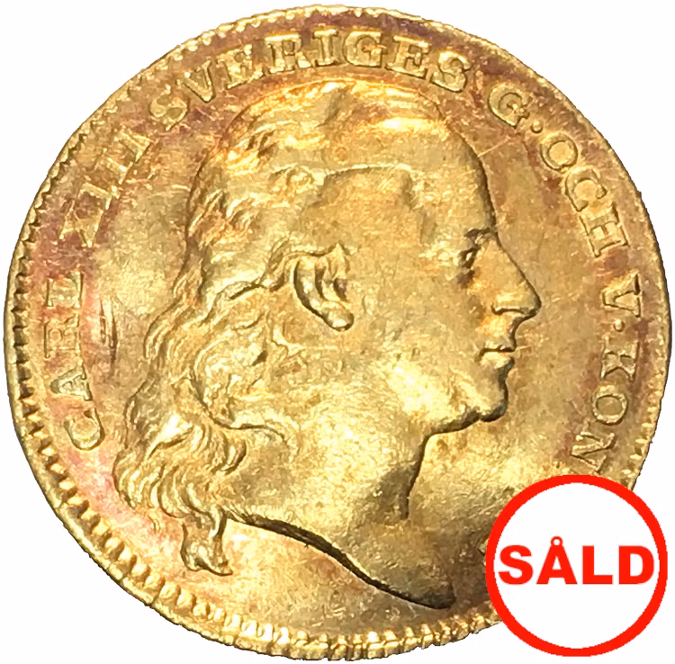 Karl XIII - Dukat 1813 - Trevligt exemplar Produkten är tyvärr slut i lager. :( Karl XIII - Dukat 1813 - Trevligt exemplarEtt trevligt cirkulerat exemplar med mindre märken av hantering. Kvalitet ca 1+, 3.48g, 21mm, SG4 (såld)