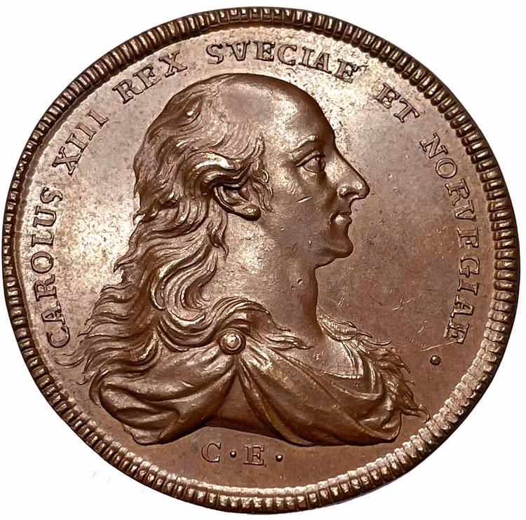 Konungens högervända bröstbild med långt, utslaget hår och mantel draperad över bröstet. Nedanför bilden gravörens initialer: "C. E.". I omskriften: "CAROLUS XIII REX SVECIAE ET NORVEGIAE".