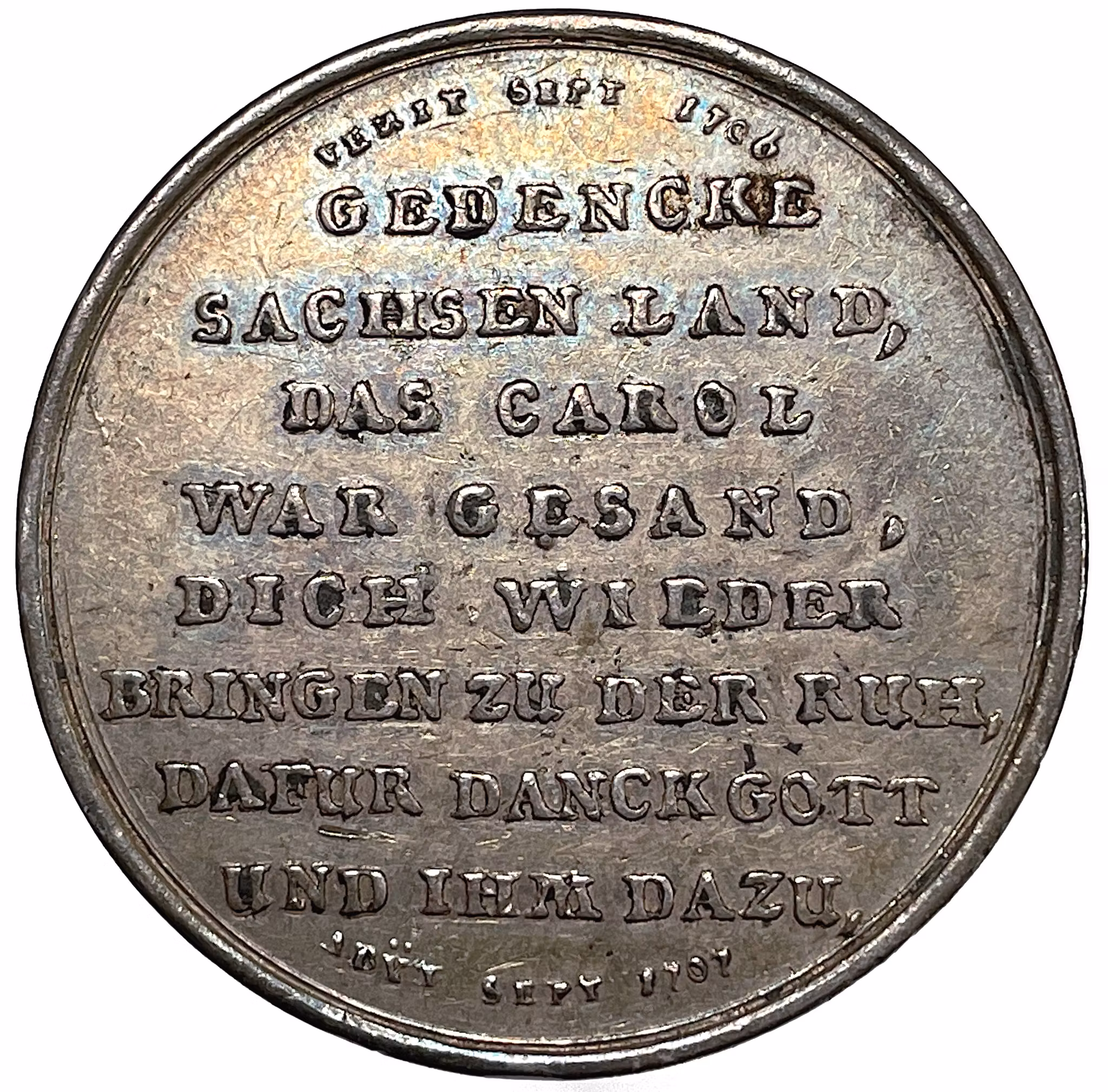 Text på tio rader: " VENIT SEPT 1706 / GEDENCKE / SACHSEN LAND, / DAS CAROL / WAR GESAND, / DICH WIEDER / BRINGEN ZU DER RUH / DAFÜR DANCK GOTT / UND IHM DAZU / ABӰT SEPT 1707". Texten kan översättas till: "Han kom i september 1706, Kom ihåg Sachsenlandet, som Karl skickades till, Att återställa dig till fred, för detta tacka Gud och honom, Från och med september 1707"