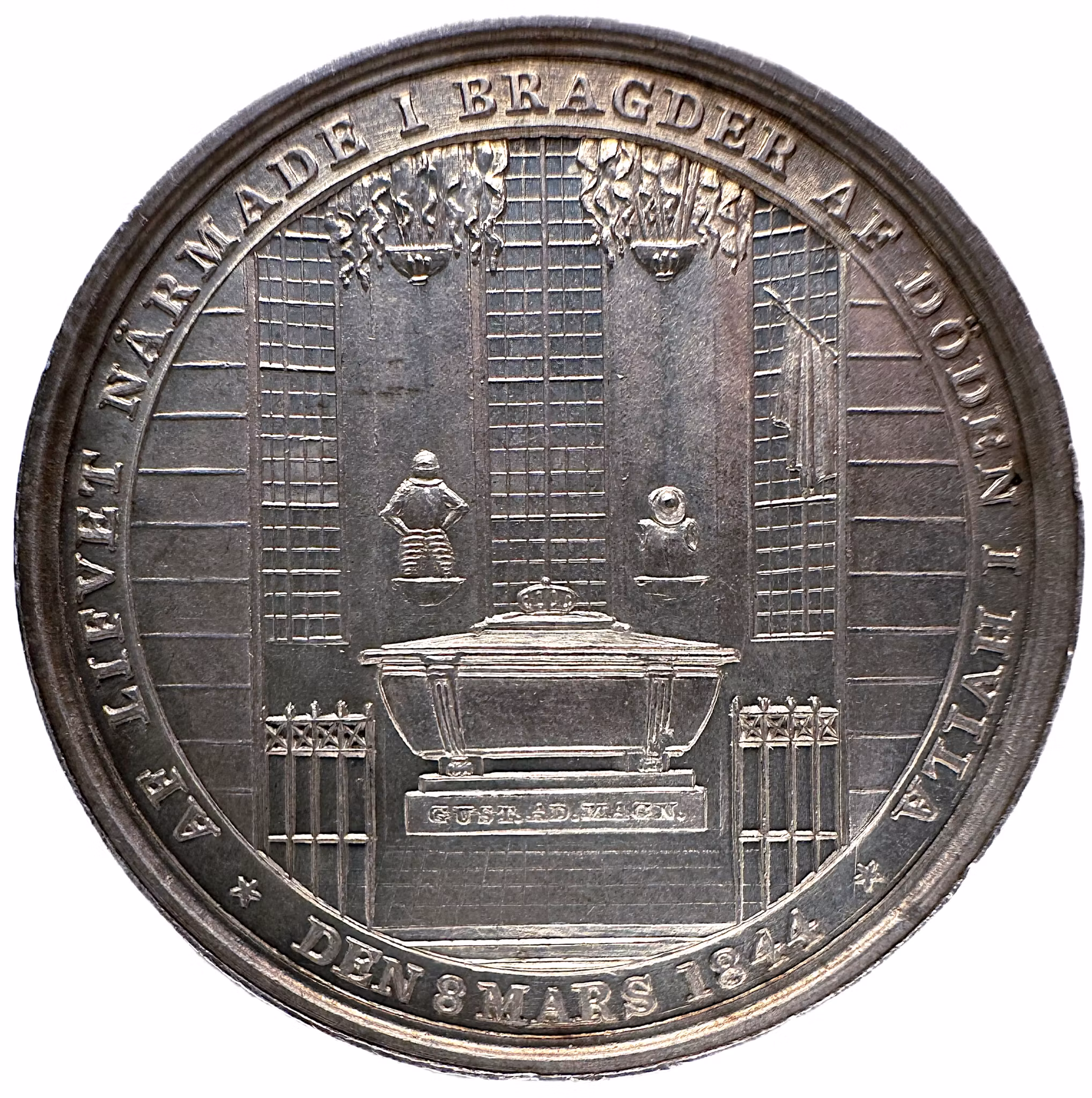 Gustav II Adolfs gravkor med erövrade fanor hängande från valvet och rustningar på pelarna. I fonden syns Gustav II Adolfs sarkofag med inskrift på fundamentet: "GUST.AD.MAGN.". I omskriften: "AF LIFVET NÄRMADE I BRAGDER AF DÖDEN I HVILA ★ DEN 8 MARS 1844 ★"