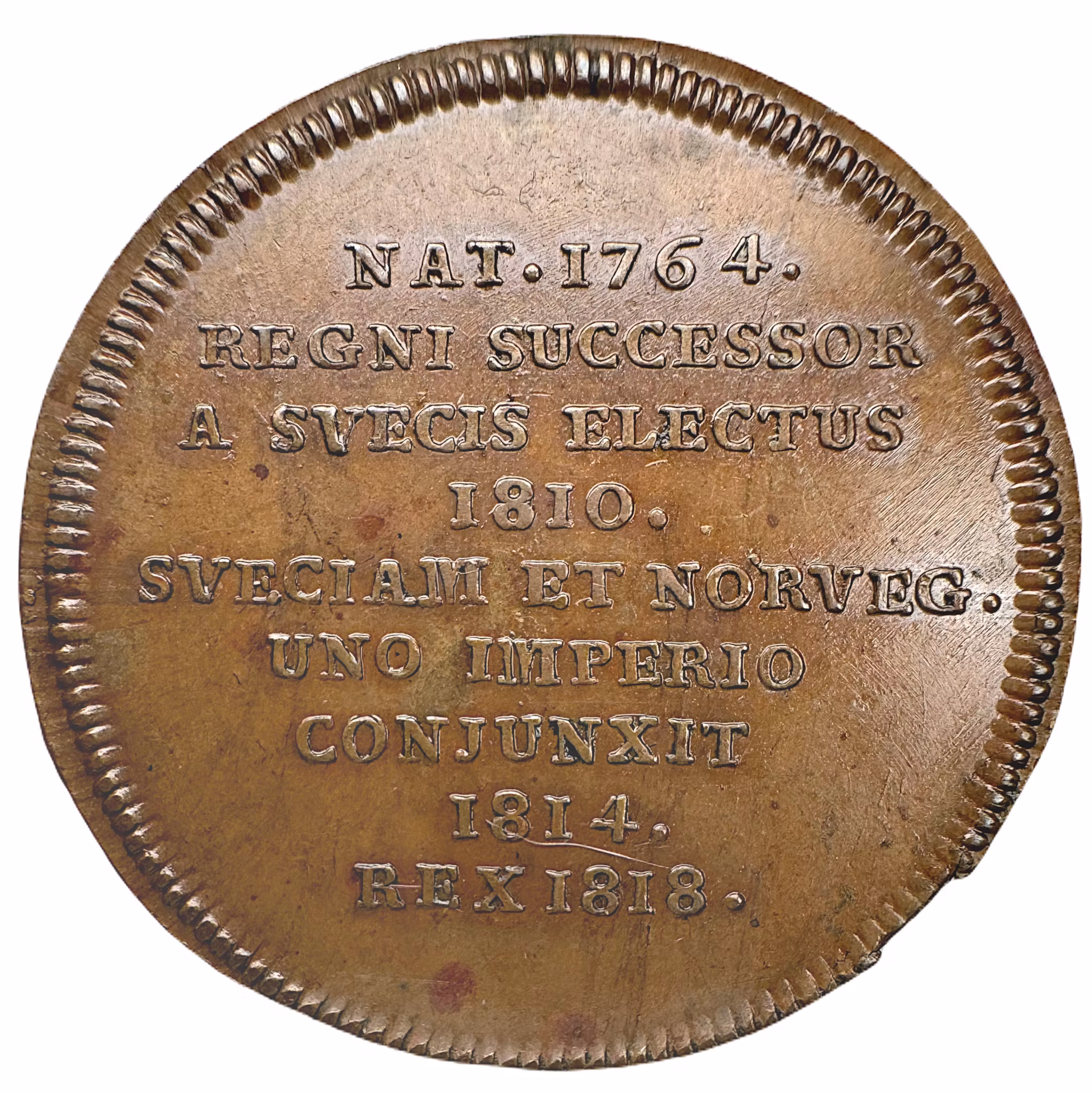 Text på nio rader: "NAT•1764• / REGNI SUCCESSOR / A SVECIS ELECTUS / 1810• / SVECIAM ET NORVEG• / UNO IMPERIO / CONJUNXIT / 1814• / REX 1818•". Den latinska texten översatt lyder: Född 1764. Vald till tronföljare av svenskarna 1810. Förenade Sverige och Norge till ett enda rike 1814. Konung 1818.".