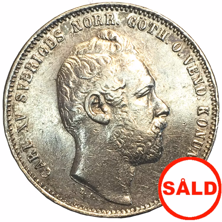Karl XV - 1 Riksdaler riksmynt 1871/61 Produkten är tyvärr slut i lager. :( Karl XV - 1 Riksdaler riksmynt 1871/61Konungens porträtt på åtsidan och stora krönta riksvapnet flankerat av lejon på frånsidan. Kvalitet ca 1+, 8.51g, 25mm