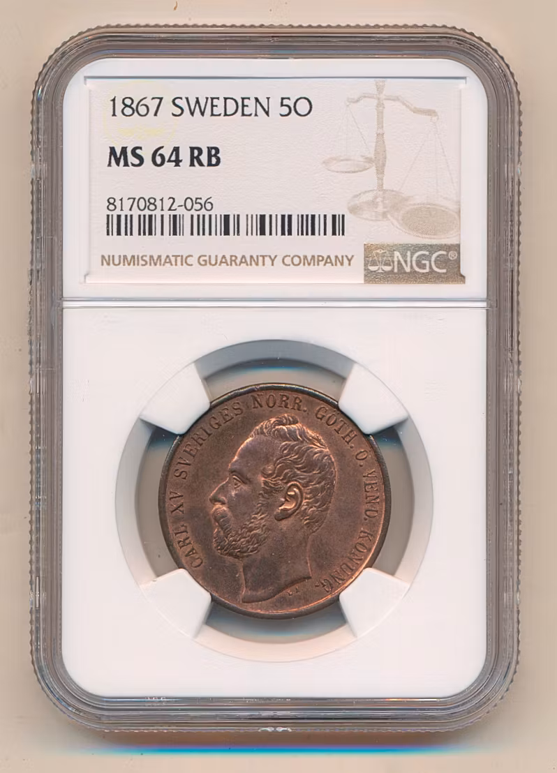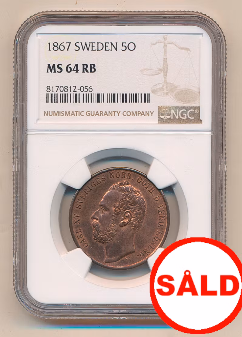 Karl XV - 5 Öre 1867 - Ocirkulerat praktexemplar med full röd lyster - NGC MS64 RB Produkten är tyvärr slut i lager. :( Karl XV - 5 Öre 1867 - Ocirkulerat praktexemplar med full röd lyster - NGC MS64 RBKvalitet 01/0, certifierat av NGC, SMB 62