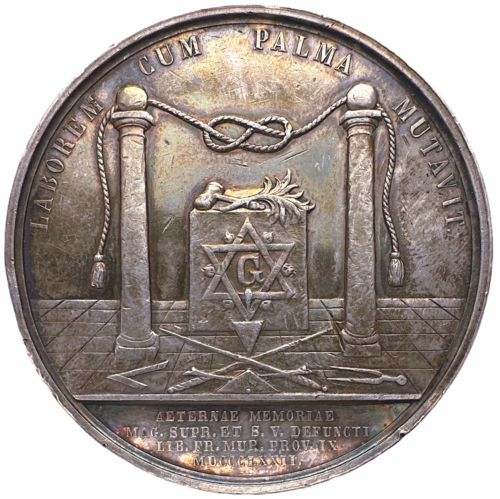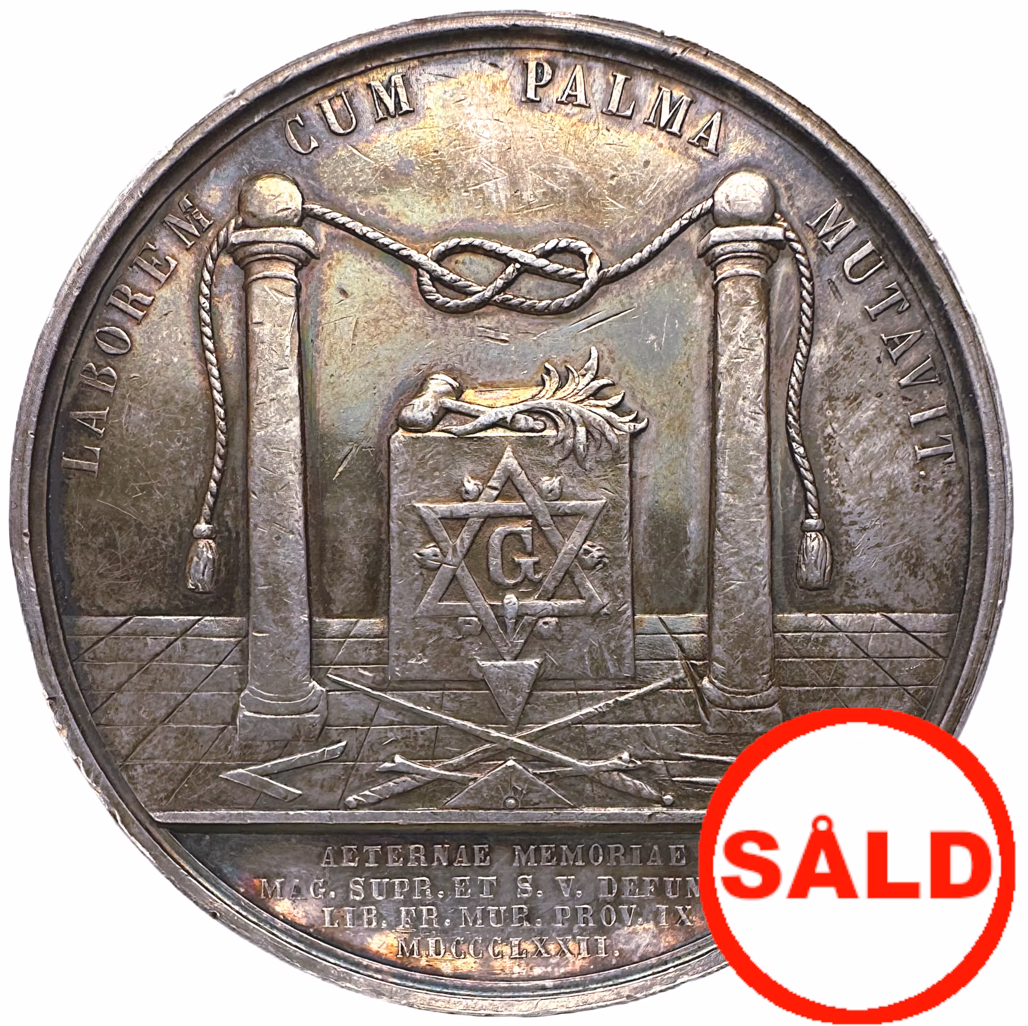 På ett rutat golv står två stycken kolonner med en kub mellan sig, på vilken det ligger en ordförandeklubba och en palmkvist. På kubens framsida syns ett G i en dubbel triangel med en liten låga i varje av de yttre vinklarna. på golvet ligger frimurareverktyg; murslev, vinkelhake, vattenpass och cirkelmätare. Två korslagda svärd ligger också på golvet. I omskriften: ""LABOREM CUM PALMA MUTAVIT" och i avskärningen: "AETERNAE MEMORIAE MAGistri SUPRemi ET Salomonis Vicarii DEFUNCTI LIBeri FRatres MURatores PROVinciae IX MDCCCLXXII". Hela texten i översättning lyder=Han har utbytt den jordiska mödan mot segerpalmen - Från nionde provinsens frimurare 1872 åt det oförgängliga minnet av sin avlidne höge mästare och styresman.