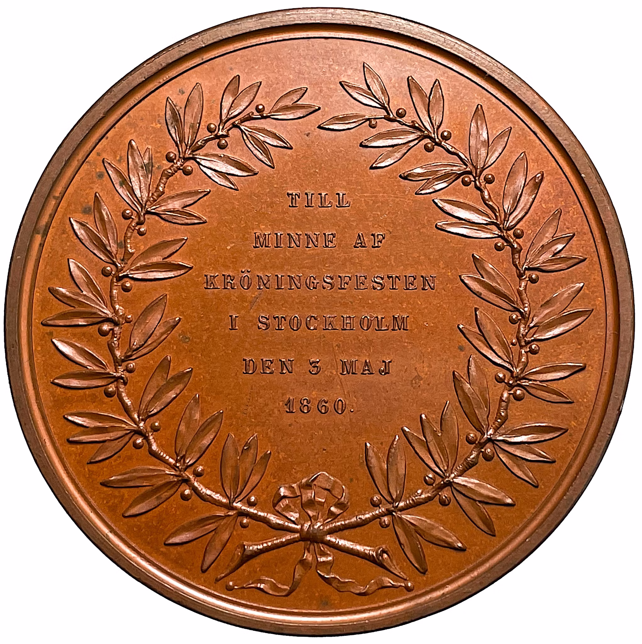 Text på sex rader inom en olivkrans: "TILL MINNE AF KRÖNINGSFESTEN I STOCKHOLM DEN 3 MAJ 1860"