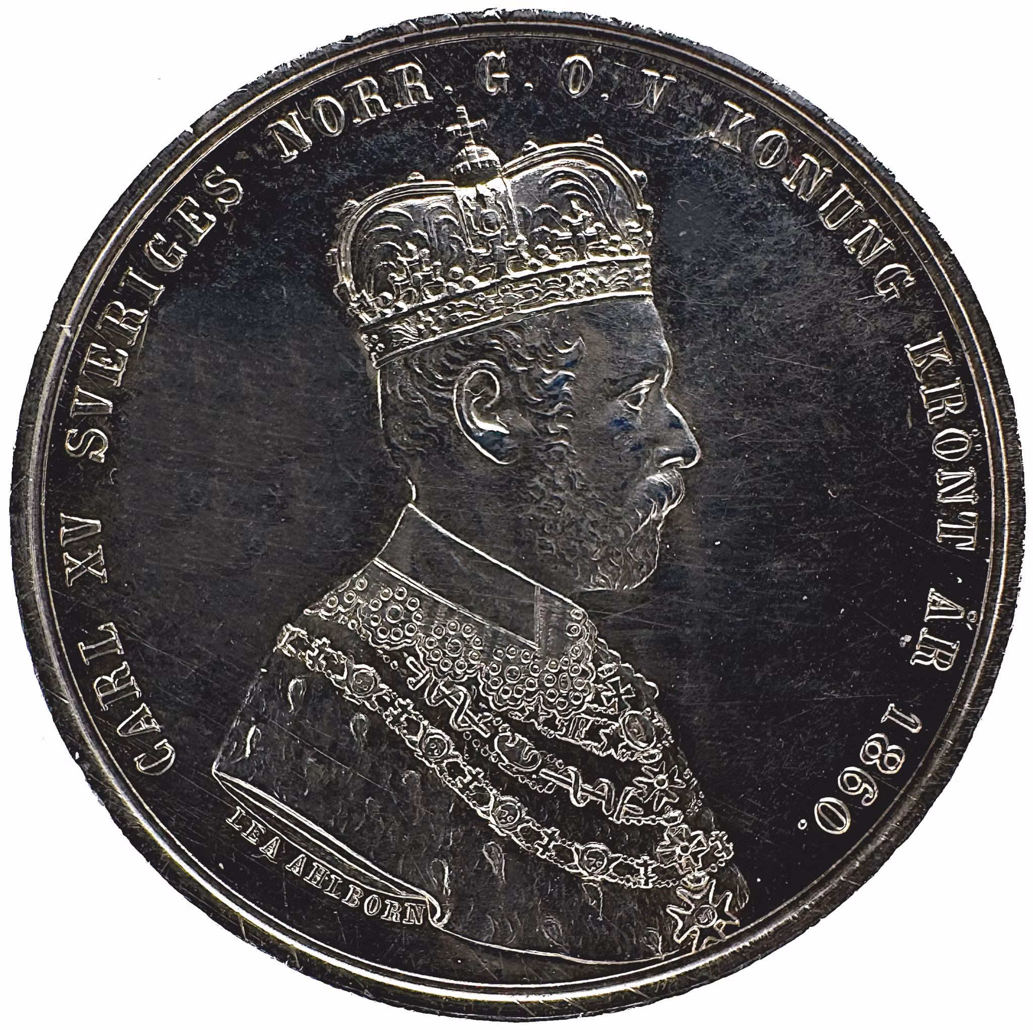 Konungens krönta högervända bröstbild ikläd full kröningsskrud med de fyra ordenskedjorna hängande på bröstet. Under bilden gravörens namn: "LEA AHLBORN" och i omskriften: "CARL XV SVERIGES NORR. G. O. V. KONUNG KRÖNT ÅR 1860"
